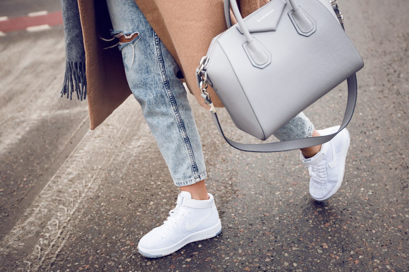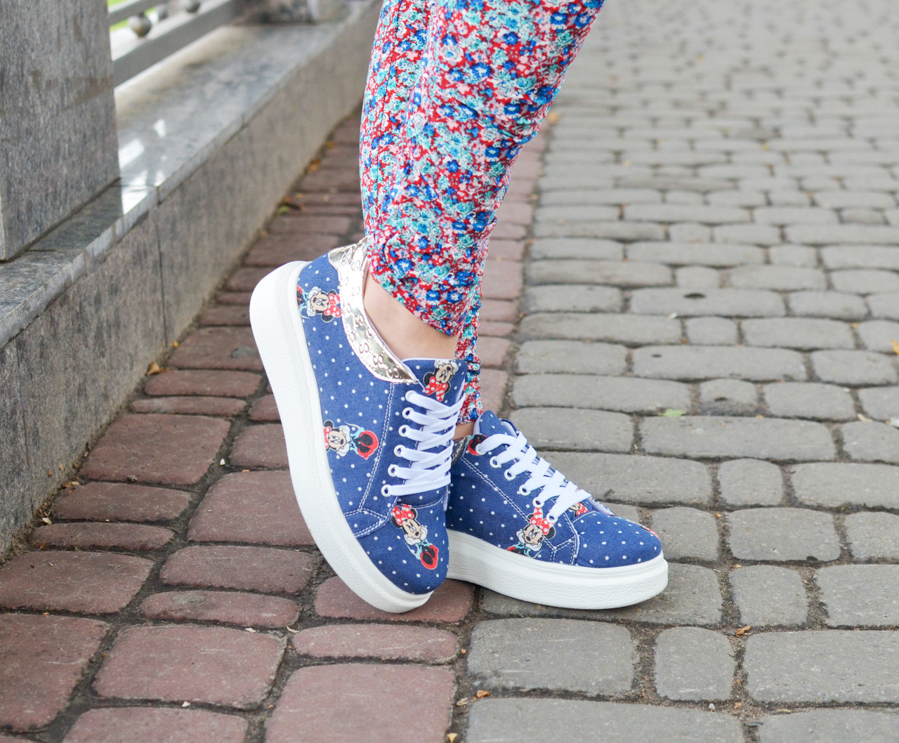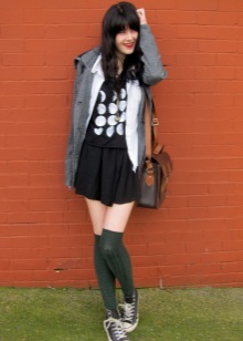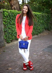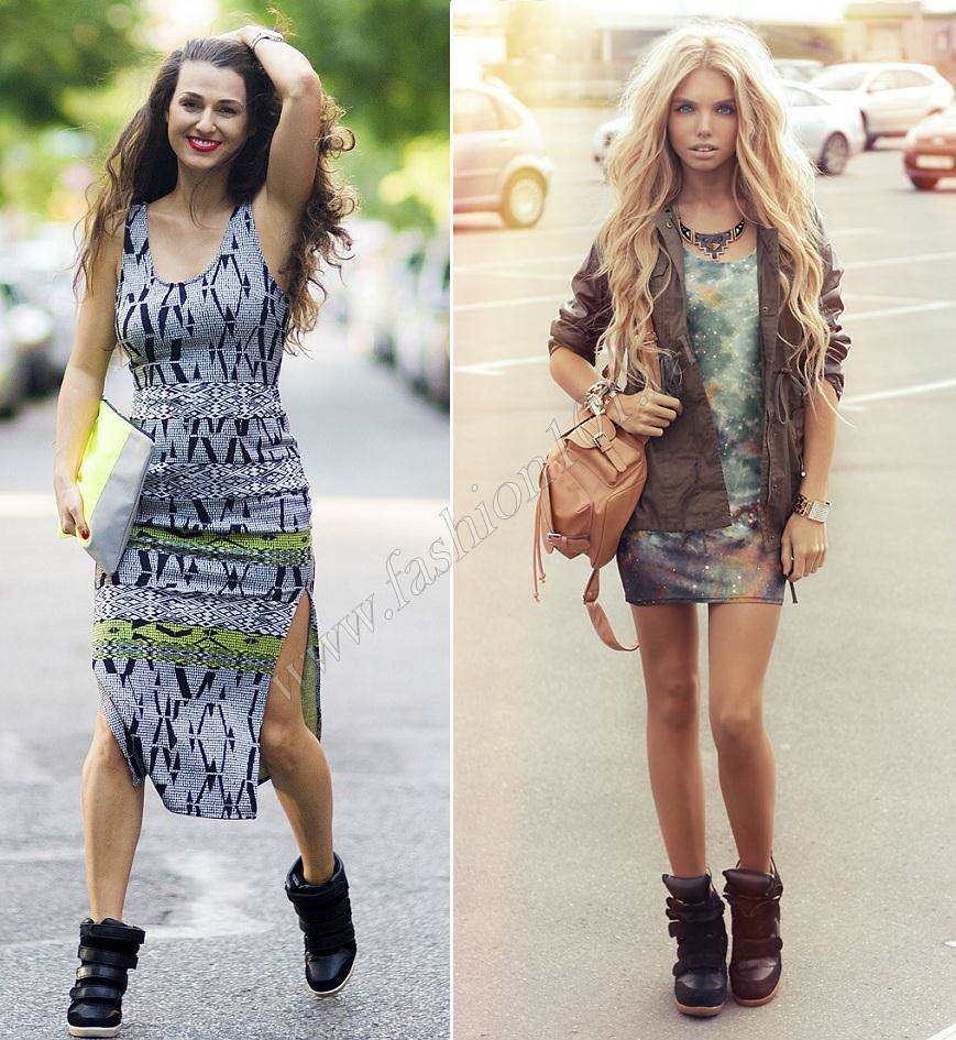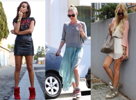 Sneakers on high soles are very popular. There is an extensive color palette. Shoes can be combined with countless clothes. Although sneakers are combined with dresses and skirts, this option is not suitable for a romantic date. The image will turn out to be impulsive - street and bold. As accessories can be used high knee socks.