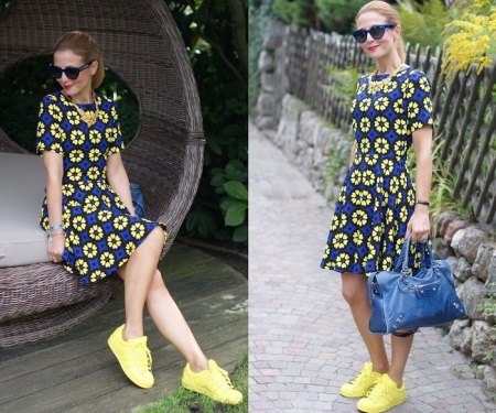 In the summer, combinations of summer women's sneakers and dresses or skirts will be popular. As always, the trend is a combination of a romantic look and coarse shoes, or neat sneaker models and straight sport dresses. It is also fashionable to wear classic suits and evening dresses with elegant models of sneakers.