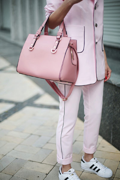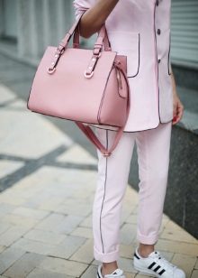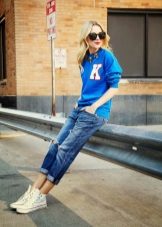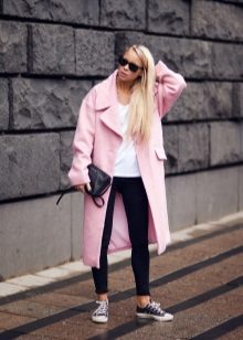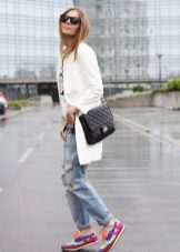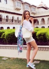 As such details you can pick up a soft stole of bright blue color, a small handbag on a long strap and stylish, matte Nike sneakers, made in blue-pink color scheme.