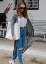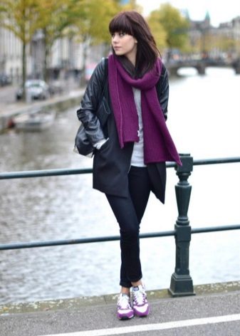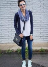 - Urban everyday life can be not only gray and boring, but also fascinating! Combining navy skinny jeans with a gray t-shirt, you should pay more attention to detail and complement the outfit with an elongated cashmere coat with a straight cut and a long knitted scarf of dark lilac shade tied around the neck.