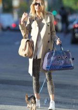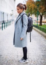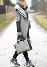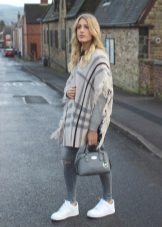 - Each outfit in gray tones needs a bright addition, so as not to be boring and dull. That is why straight light gray trousers with a checkered print, in combination with a thin drape coat without a buckle, need bright details.