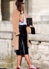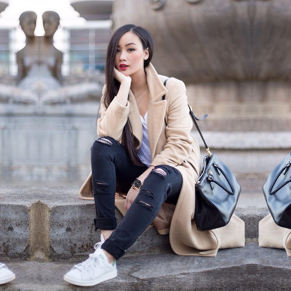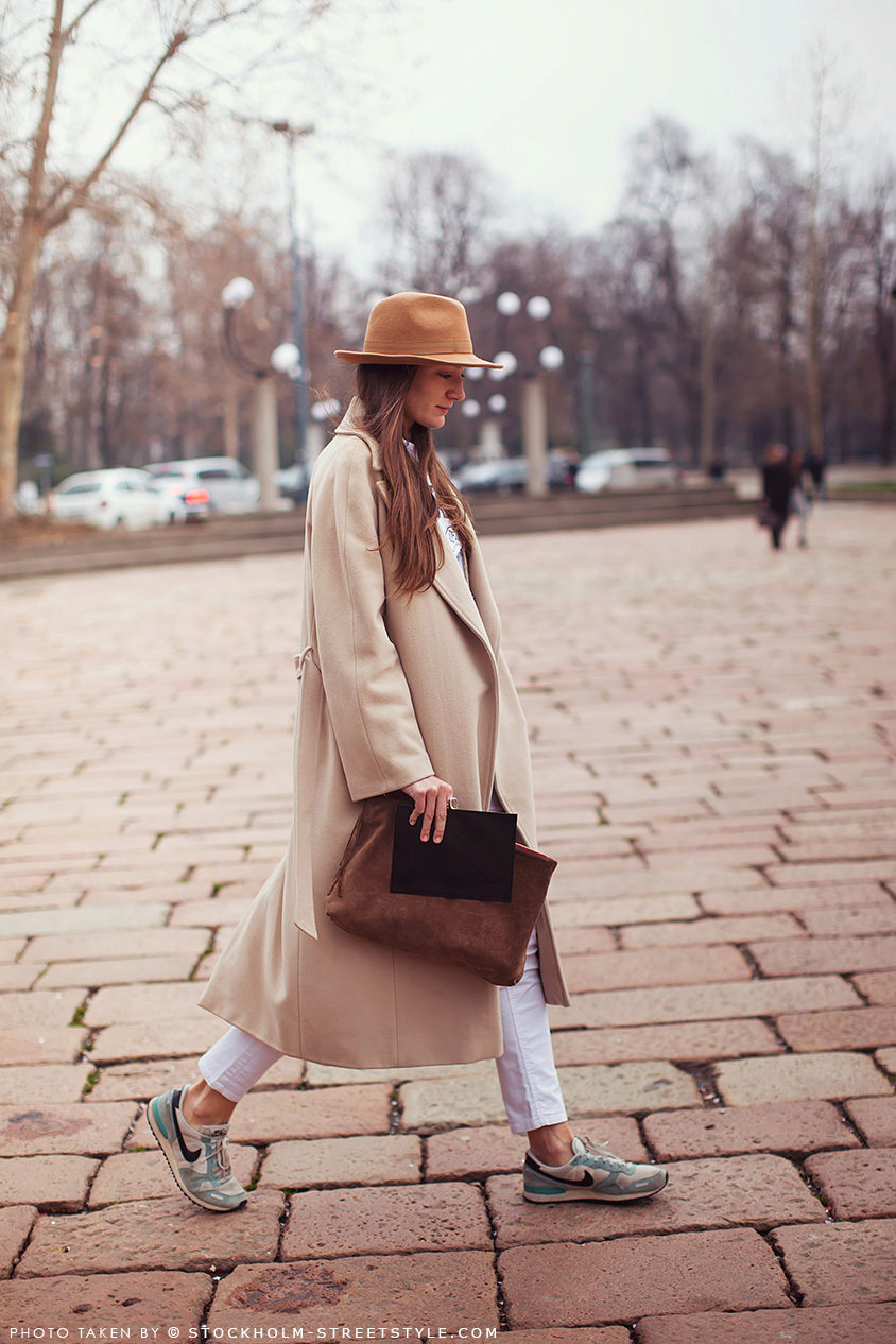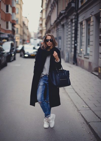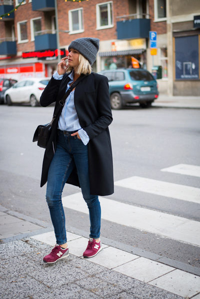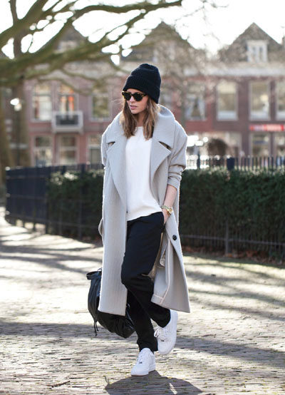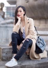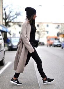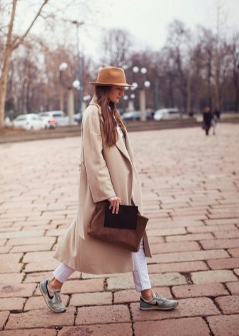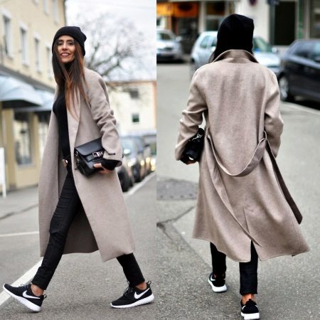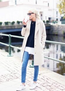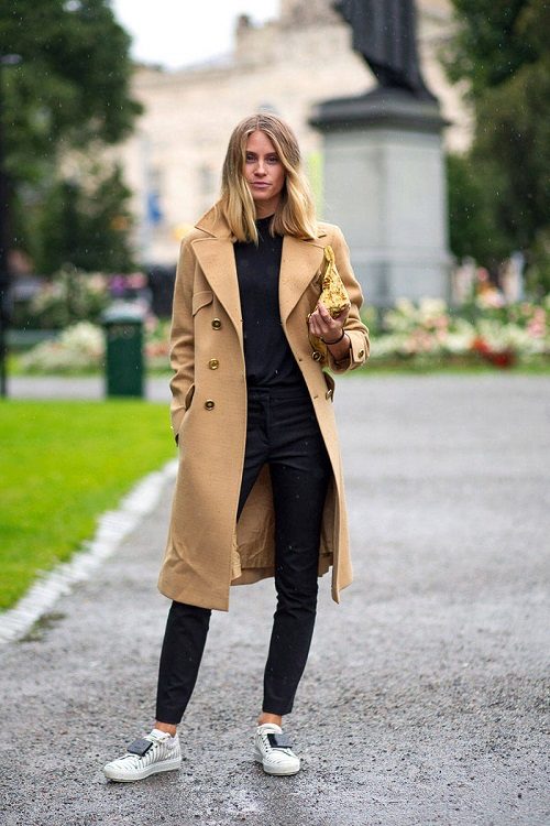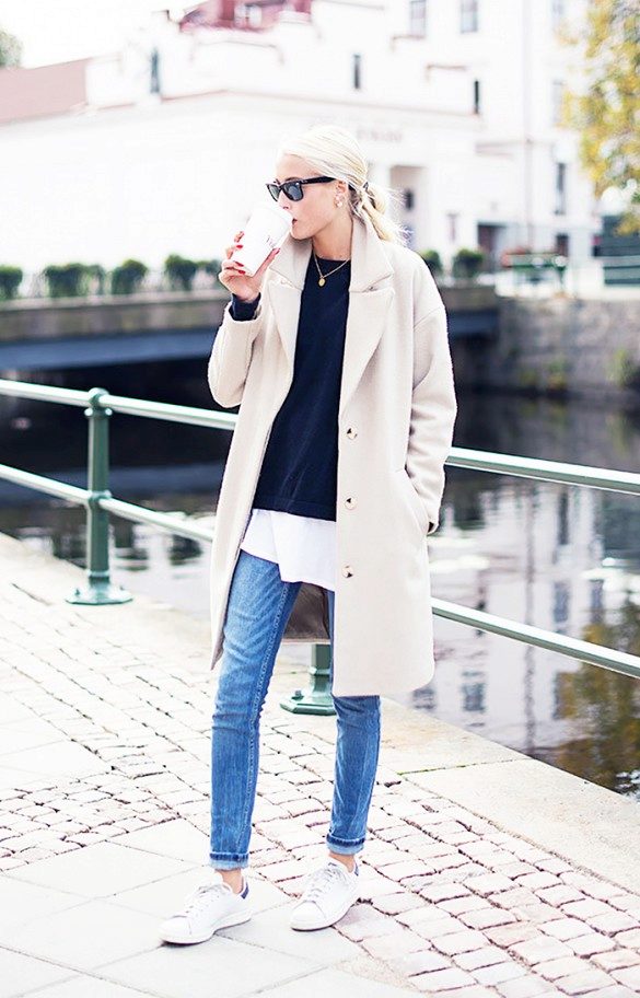- In the autumn cool it is just necessary not only to feel warm and comfortable, but also to feel fashionable and stylish. This everyday combination of black things, namely sweaters, tight jeans and hats, needs a lighter complement, which is a midi-length cashmere overcoat in a light cappuccino hue.