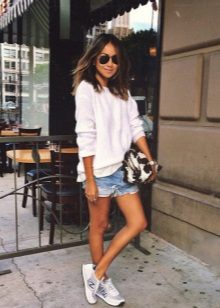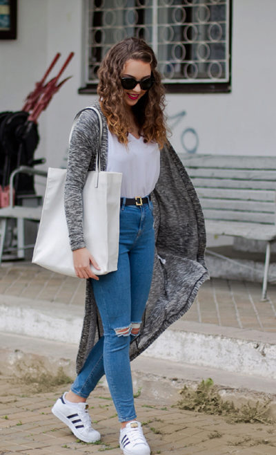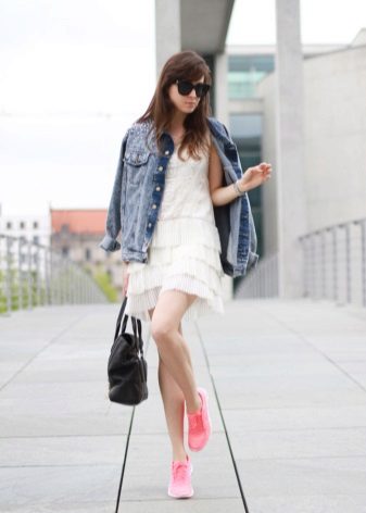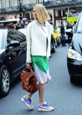 - A gentle look can also allow the relevance of some models of sports shoes. For example, the combination of a light chiffon top and a white lace skirt with a high waist, complemented by a light cotton cardigan midi length, can also look good with sneakers.