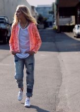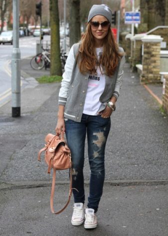 - Hooligan, casual style always attracts a lot of interested views. And this outfit will not be an exception, therefore, choosing narrow jeans, it is better to stop your eyes on a model of dark gray with torn knees. Plaid shirt and leather leather jacket - what you need to create harmony in the dress.