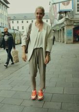 A bright coral-colored sneakers are not just bright detail, but also a kind of decor.