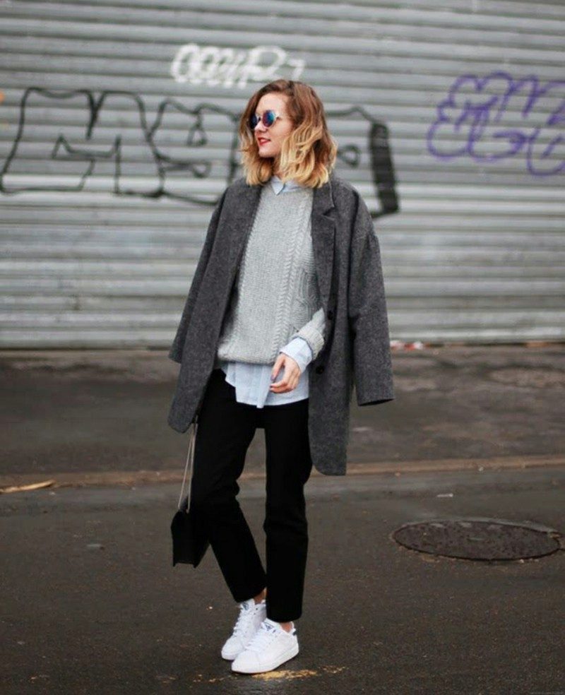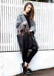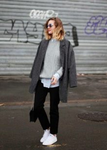 - Autumn outfit with notes of comfort and convenience will have to like any fashionista. Black trousers in a skinny model, a gray knit sweater made of thick yarn, a black cashmere coat and a warm scarf with a dark-colored hat are perfect for this occasion.