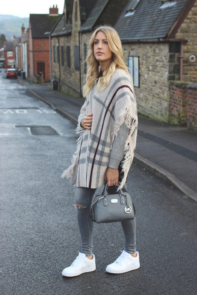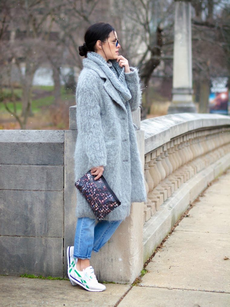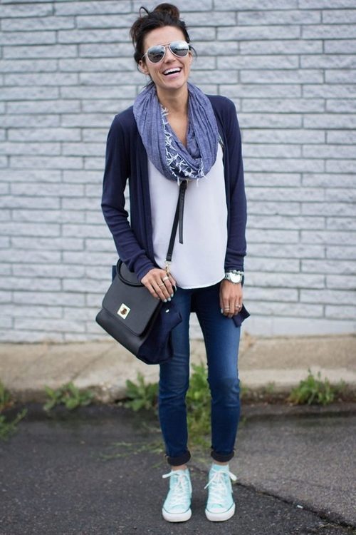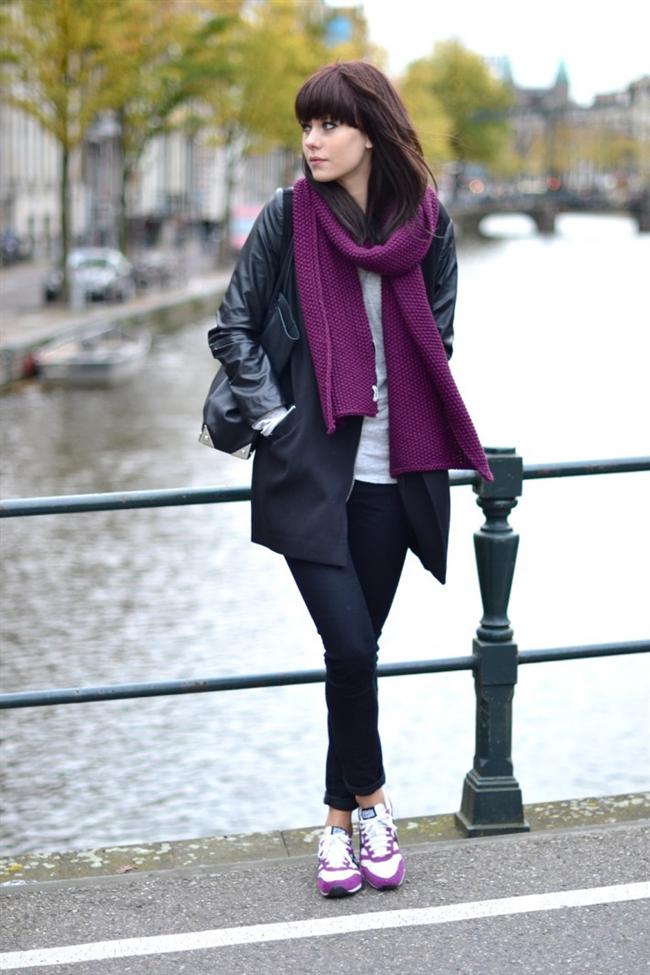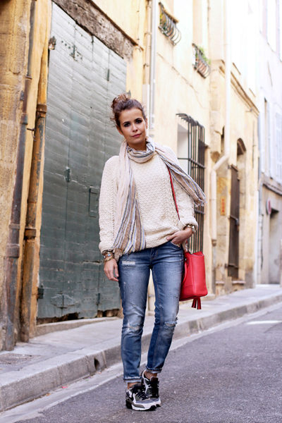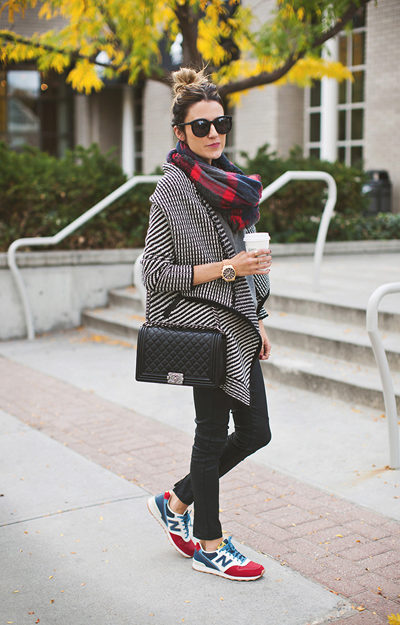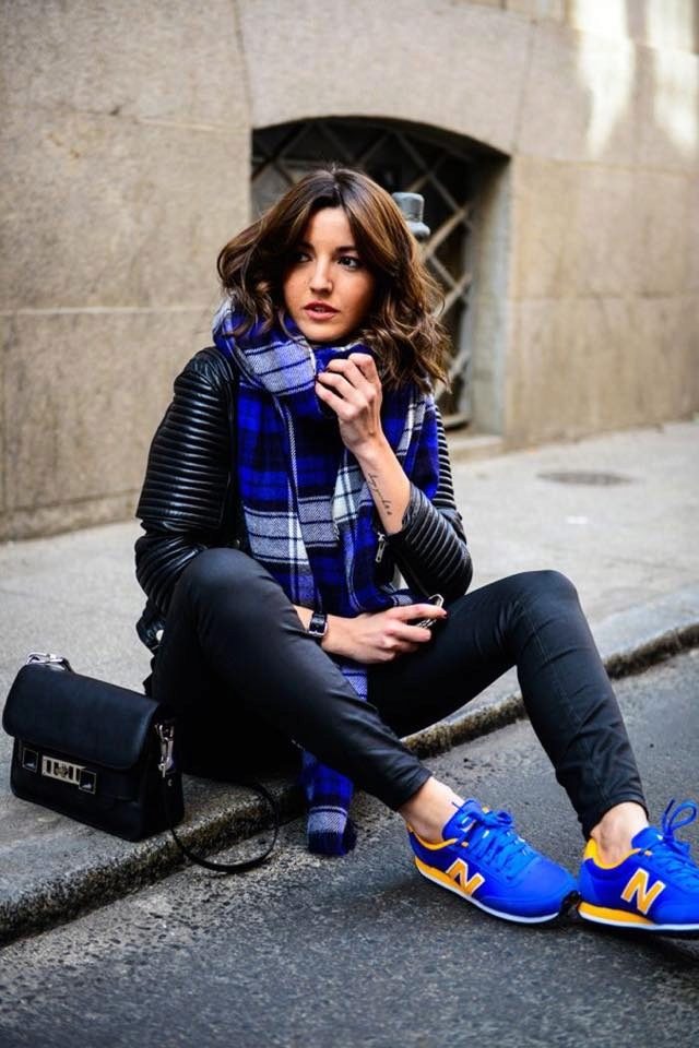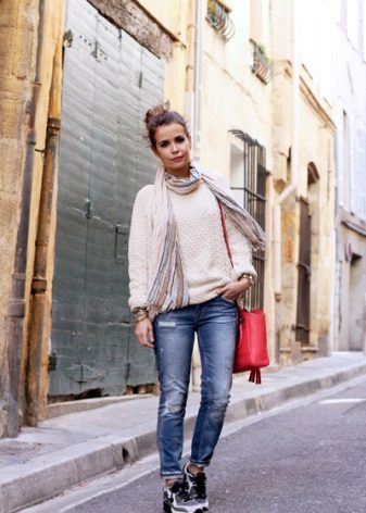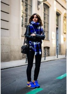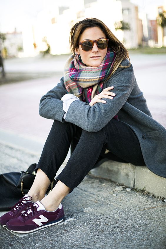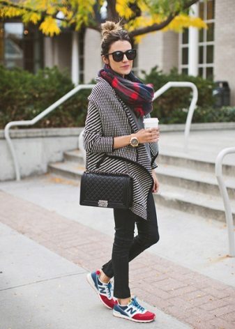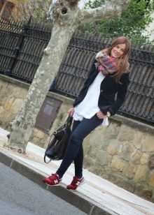A massive plaid scarf, a small handbag with an animal print and bright crimson sneakers made from genuine suede are exactly what you need to make this look more interesting.