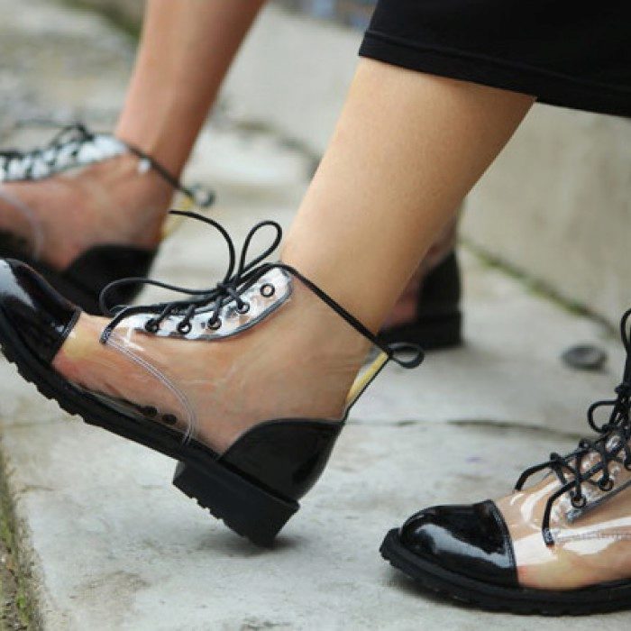 - To a very unusual, non-standard solutions include transparent sneakerswhich are often used as rubber boots suitable for rainy weather. But the product may not be practical, because in the field of lacing water still can fall.