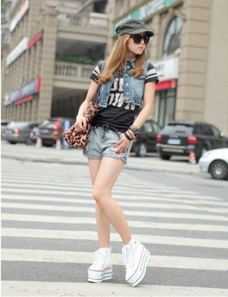 Best of all wedge sneakers fit under straight pants or under the skirts of a strict cut with tight tights. The main thing is to successfully select all the elements of the image by color.