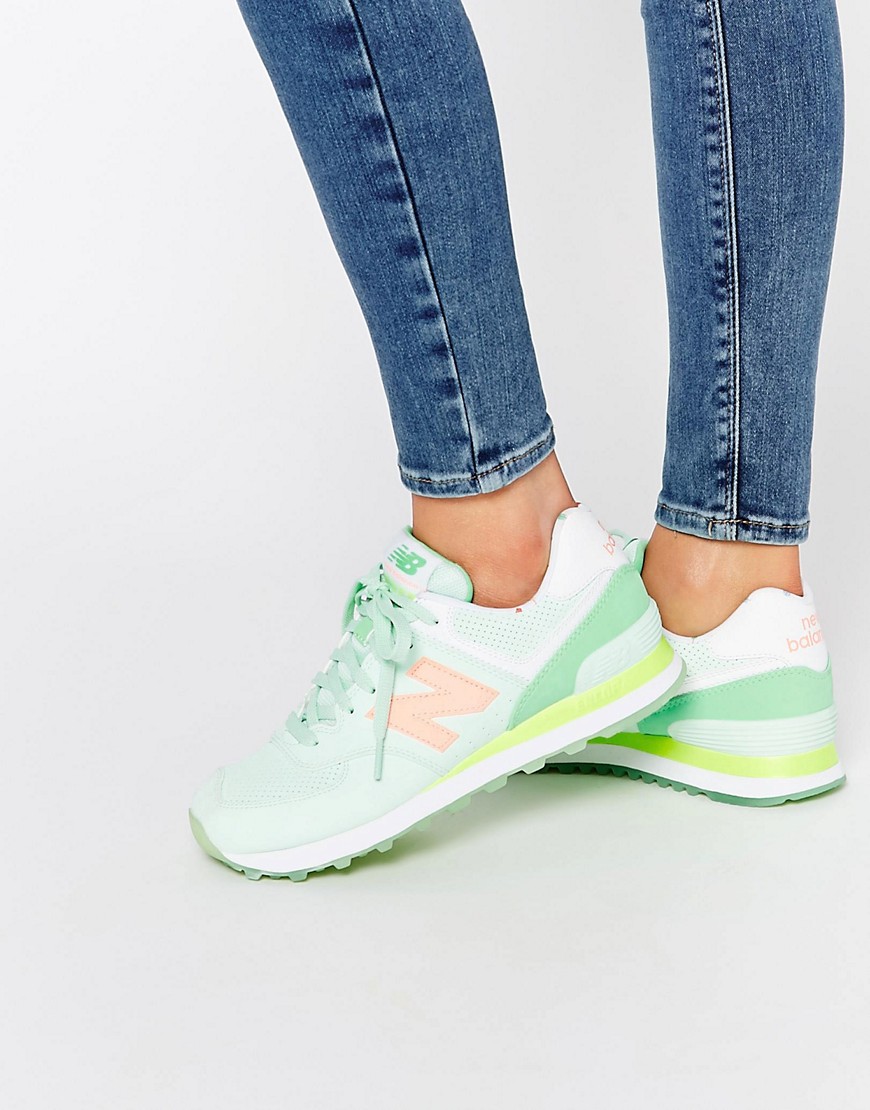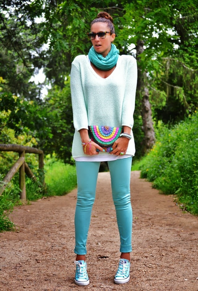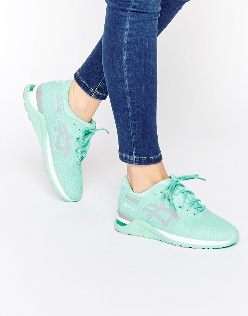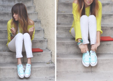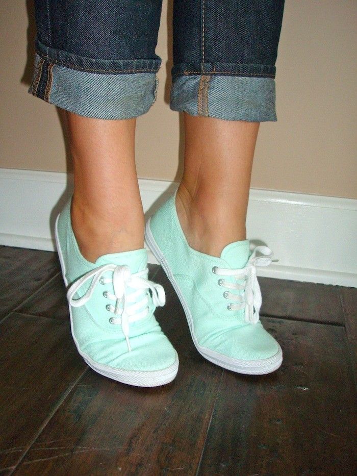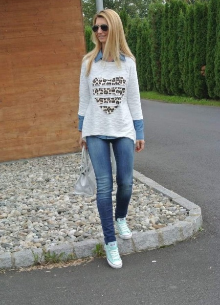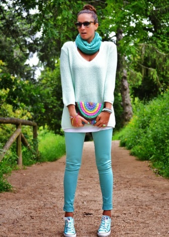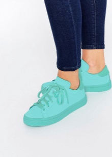 Mint-colored sneakers look great with skinny jeans and boyfriend jeans, complemented by top riding in casual style. In the warmer season, different shorts are suitable, be it a denim model or a lighter version of chiffon, cotton or flax.