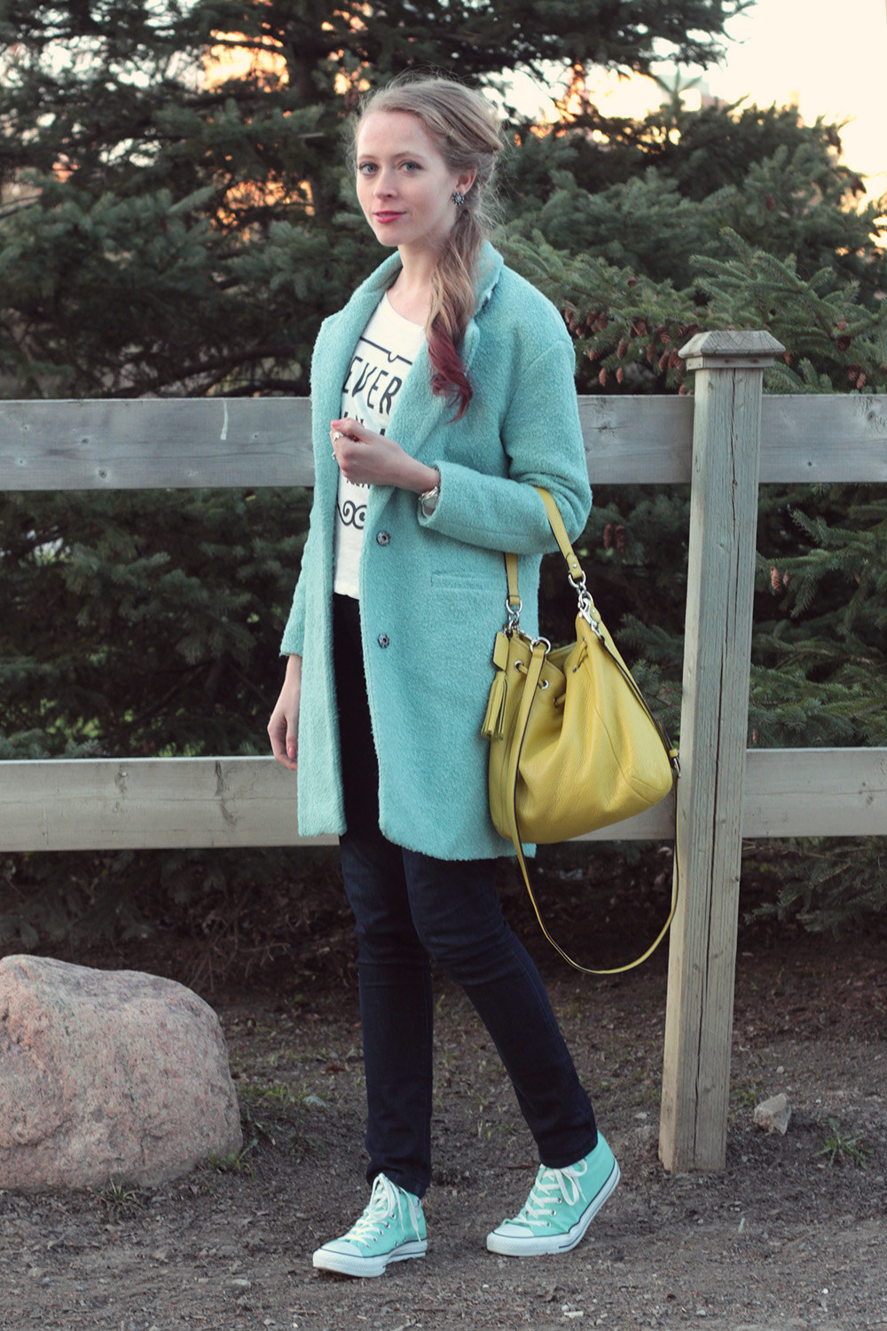 Stylish, casual look consists of ripped jeans - boyfriend with cuffs and a loose mint t-shirt. Sneakers to match the perfect match for this combination, and a large bag will act as an unusual, bright details.
