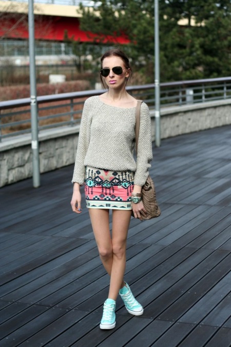 A feminine look, consisting of a light gray-brown sweater made of thick yarn, and a tight-fitting mini-skirt with a print in Indian style. Mint high sneakers perfectly complement this outfit.