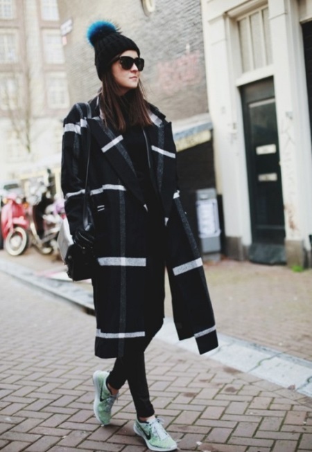 Mint Nike sneakers with a black Nike emblem are able to dilute even the most boring image. Therefore, they will perfectly fit into a dress with narrow black jeans and a felt coat in a large cell in the oversized style.