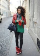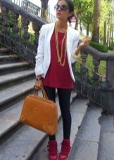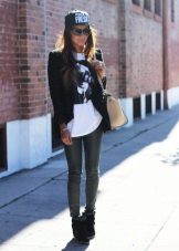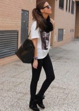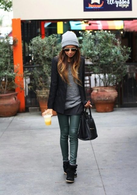 - Another example of a versatile casual look consists of skinny jeans, an elongated jacket, and a tunic in combination with black arrowroot.The black jacket and black sneakers on the platform do not coincide in color by chance - thus the color combination is balanced, the gray tunic with the transition to dark gray also contributes to the "color" balance. Effectively complement the image of a knitted hat-stocking in gray, the tone is lighter than the tunic, in the cool off-season. Bag fit bulk, black or a few tones lighter. You can complement the image with dark glasses in a fashionable round frame.