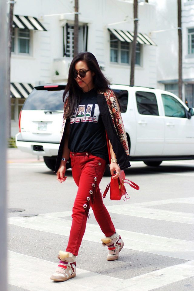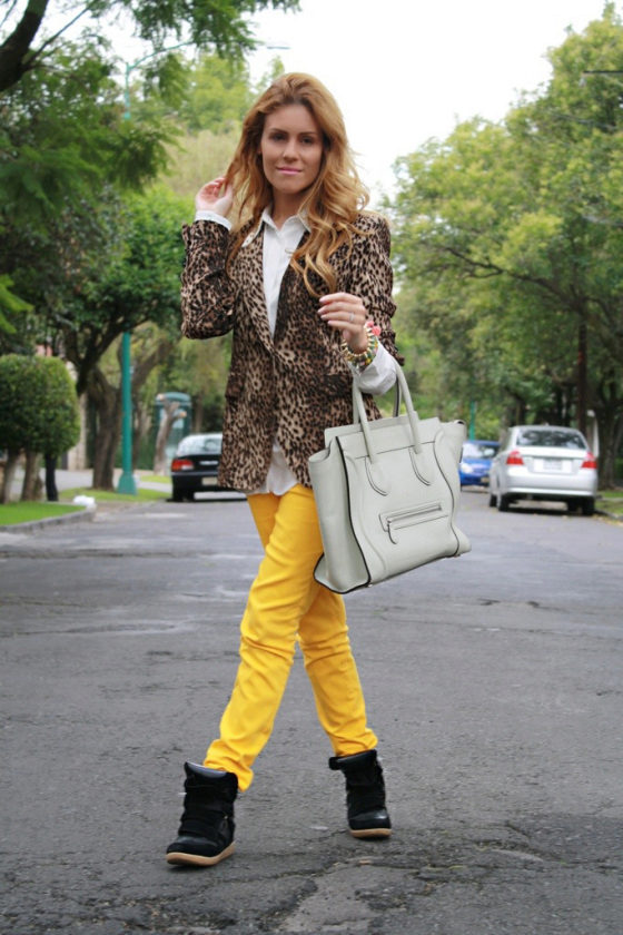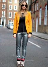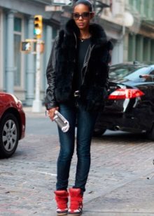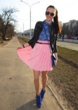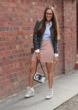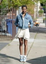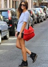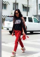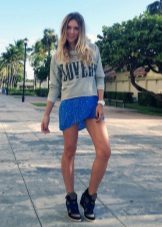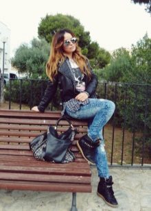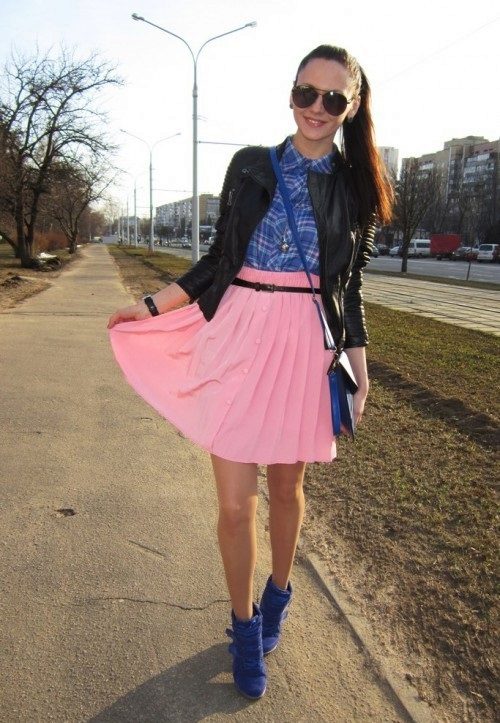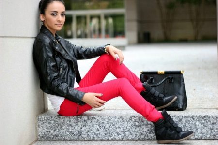 The most versatile combination will be jeans, but only narrowed or tightened inside sneakers on the platform. Any denim items such as shirts, short shorts, skirts are also ideal for such shoes.