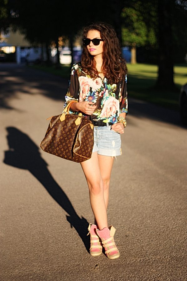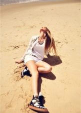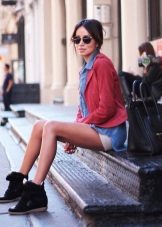 - White-and-blue sporting girdles go well with short denim shorts. The platform visually lengthens the legs, short shorts "support" in this visual effect. A denim shirt with a combination of light and dark colors harmoniously complements the look. A brown leather belt accentuates the denim tandem. This image is suitable for everyday life, exploring the city, for recreation.