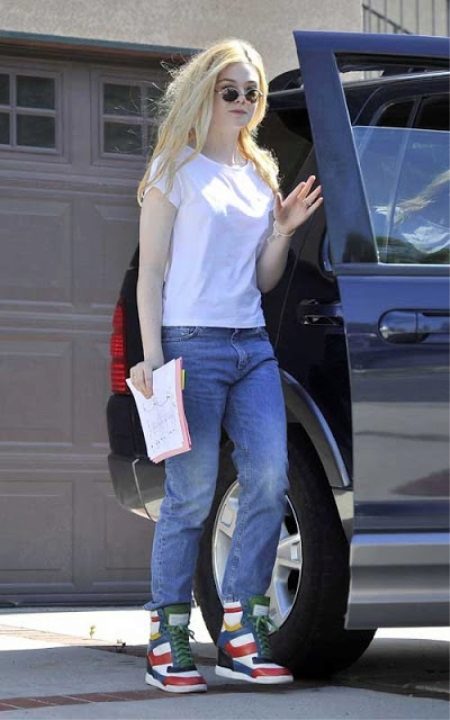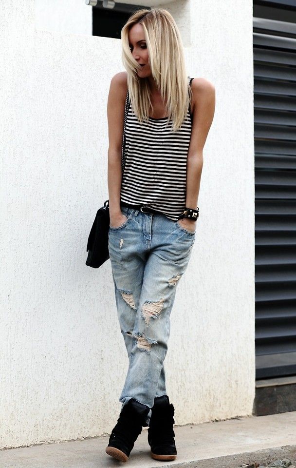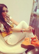 - A versatile combination of slim straight, light-colored jeans and plain white T-shirts with platform sneakers. A simple top "brightens up" the brightness and multicolor sneakers. Hidden platform adds height, the height of the sneakers allows you to wear them in bad weather. High lacing, contrasting color stripes attract attention and make these shoes the main focus of the image.