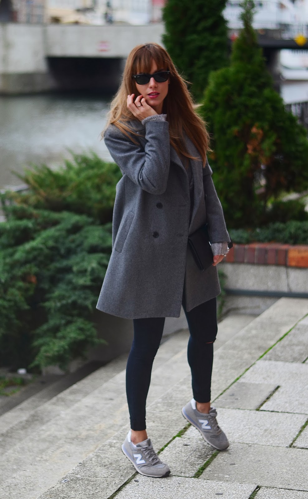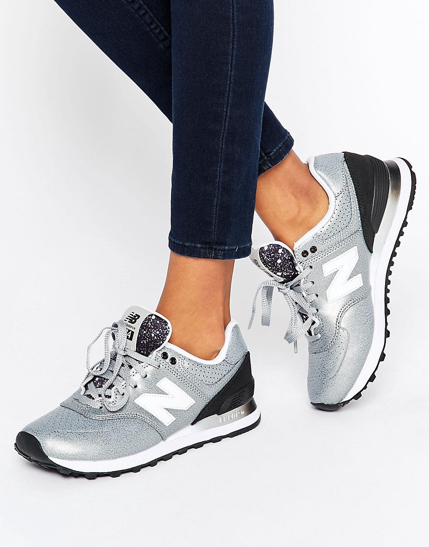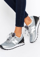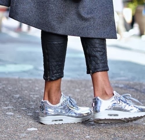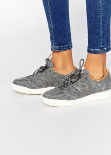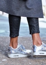 Gray sneakers blend harmoniously with clothes designed in cold colors. For example, with blue pants and a blue top. Trendy bow will complement effectively a stylish turquoise handbag. Silver sneakers look best with clothes of light, pastel colors. The image is stylish and quite elegant.
