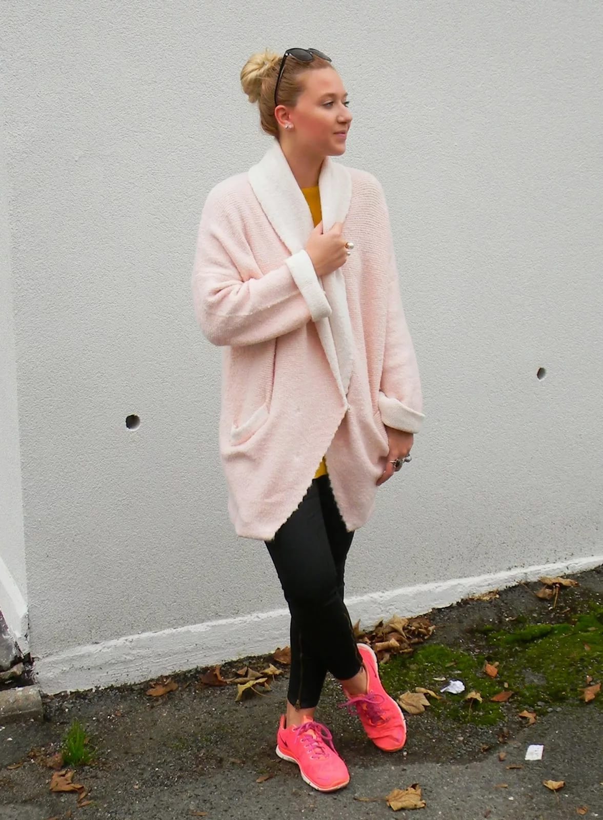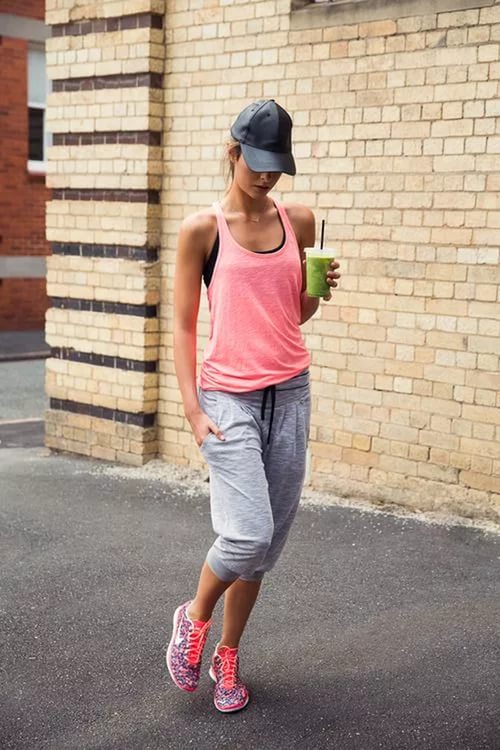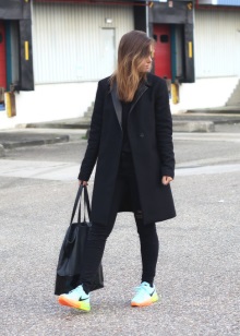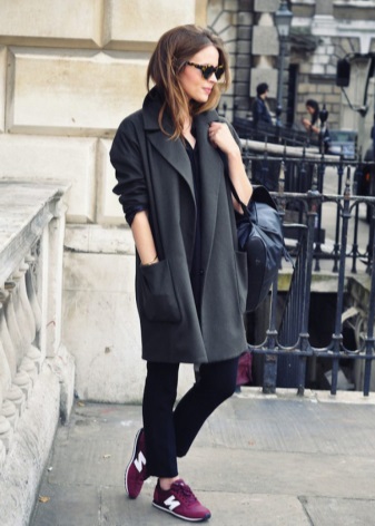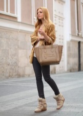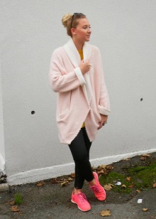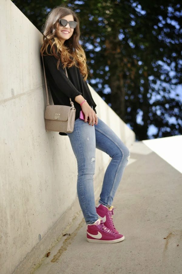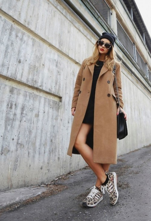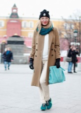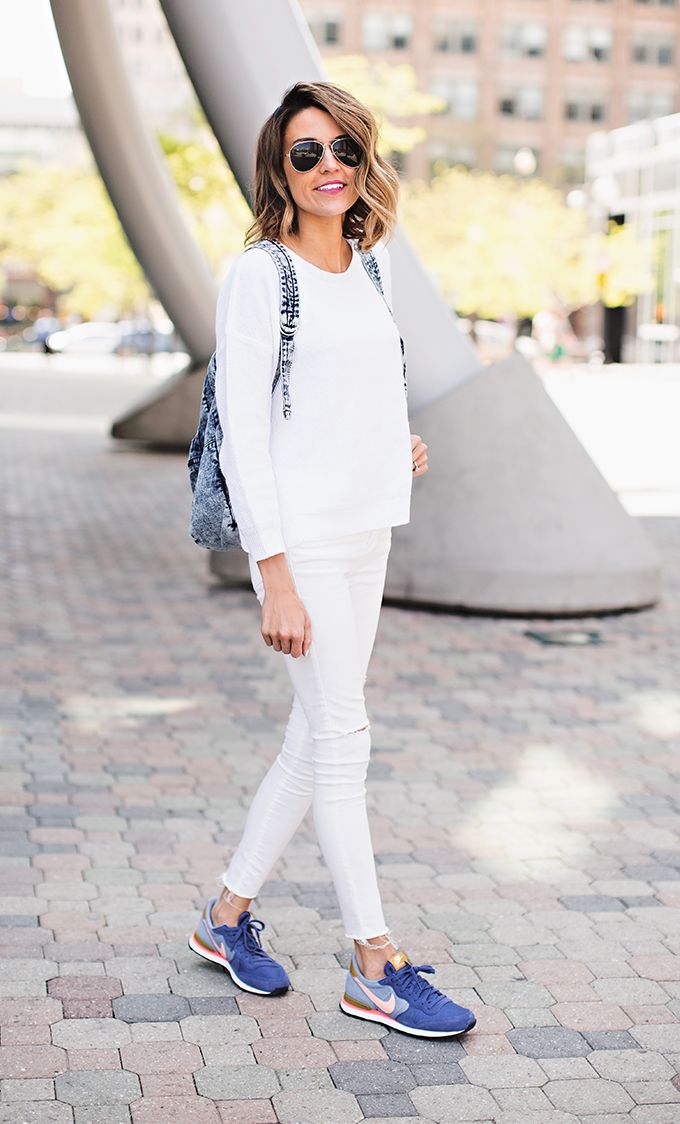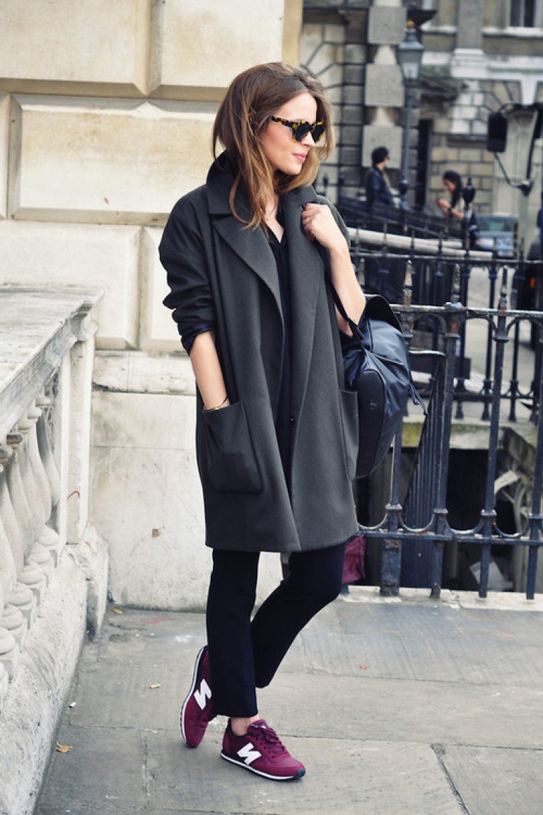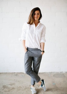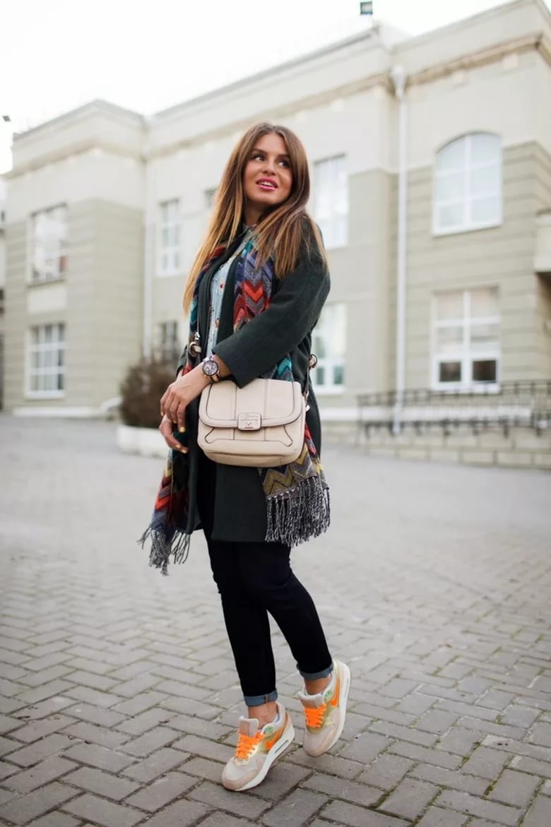 Beige or brown sneakers look great with blue jeans and black pants. A light blouse, sweatshirt, turtleneck, cardigan or sweater can be selected as the top. A pale pink scarf or some sand or pink accessory will be an excellent addition to an image in light, soft tones.