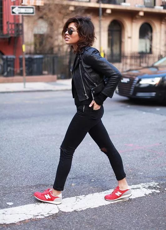 Bright red sneakers are a great way to draw attention to your look. Carefully choosing clothes for such bright sneakers, you can create completely different images. This may be clothes of a contrasting color, for example, black jeans with a top or white pants and a sports shirt. Red sneakers will add bright colors to the image in calm, neutral shades.
