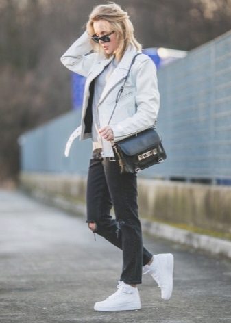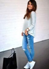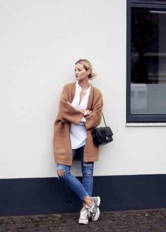 - Trendy light blue ripped jeans — boyfriends in combination with a white cardigan and an elongated model will go perfectly with suede color sneakers.