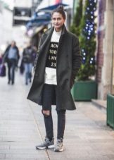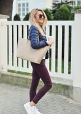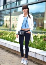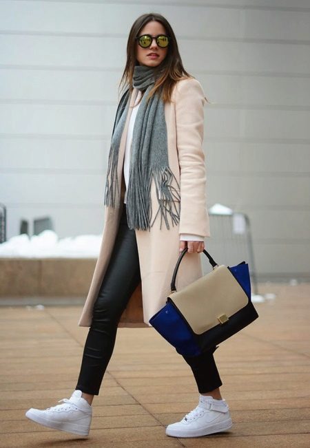 - Black leggings from the material "under the skin", a light blouse and a cashmere coat of shade of creme brulee, perfectly complemented by a stylish bag and white sneakers of the classic model.