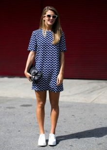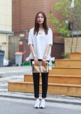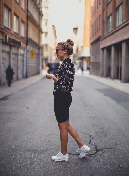 - White sneakers will fit perfectly into the image with a narrow skirt - a black pencil and a black chiffon blouse with a print in the form of white lettering.