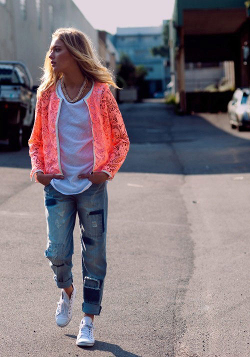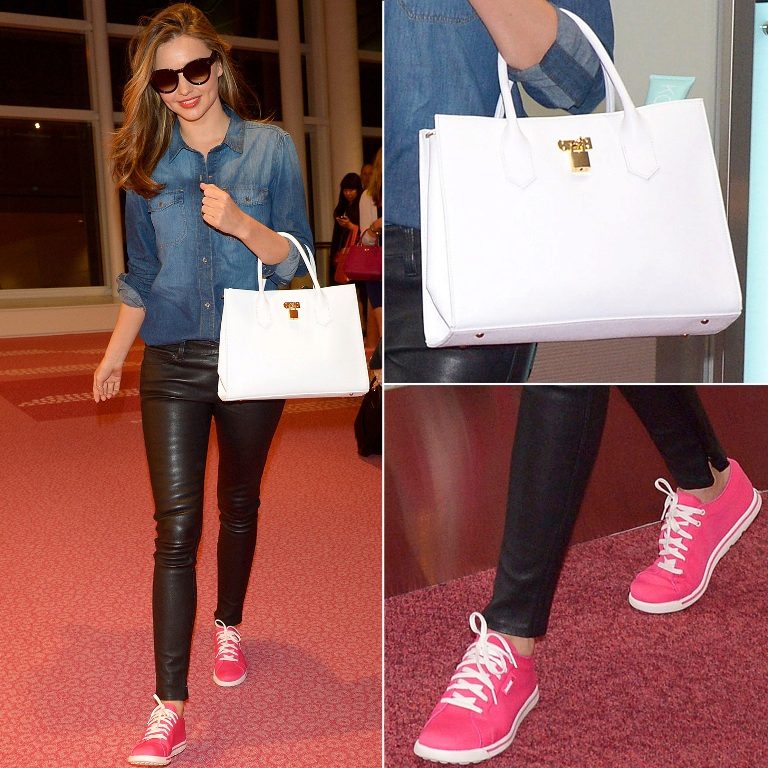 - White tight pants and a tank top in combination with a blue jacket and a black bag, perfectly complemented by bright pink sneakers.