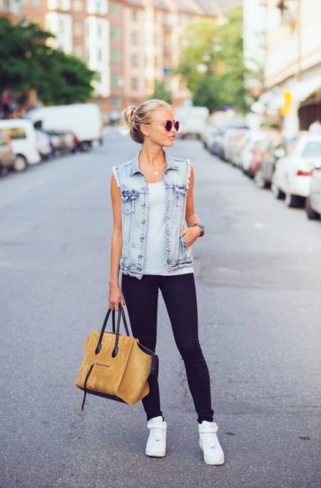 - Blue slim trousers, a white tank top and a stylish light blue shorts denim vest will look great with a large sandy-colored suede bag and white sneakers.