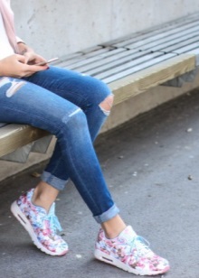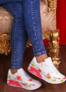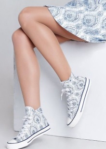 As a rule, the floral print is not very bright and the background for them is mostly light. What is to wear floral print sneakers? White floral sneakers are well suited for a romantic and gentle look. They can be combined with sundresses or overalls and light jackets, denim shorts, skinny jeans and various air blouses and shirts. Such ensembles will be the perfect solution for a date.