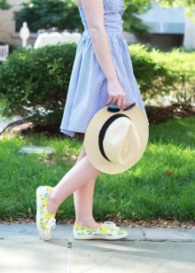 - It is not necessary to combine shoes with a floral print with more than one other thing with a floral pattern. You need to know a sense of proportion and do not turn into a walking bouquet. It is better to choose monophonic clothes, in peas, a cage or a strip.