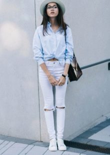 Jeans should not be long, even better if they slightly open the ankle. It is better to even roll up the pants so that they look more impressive.