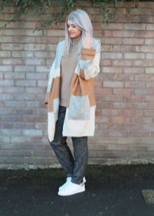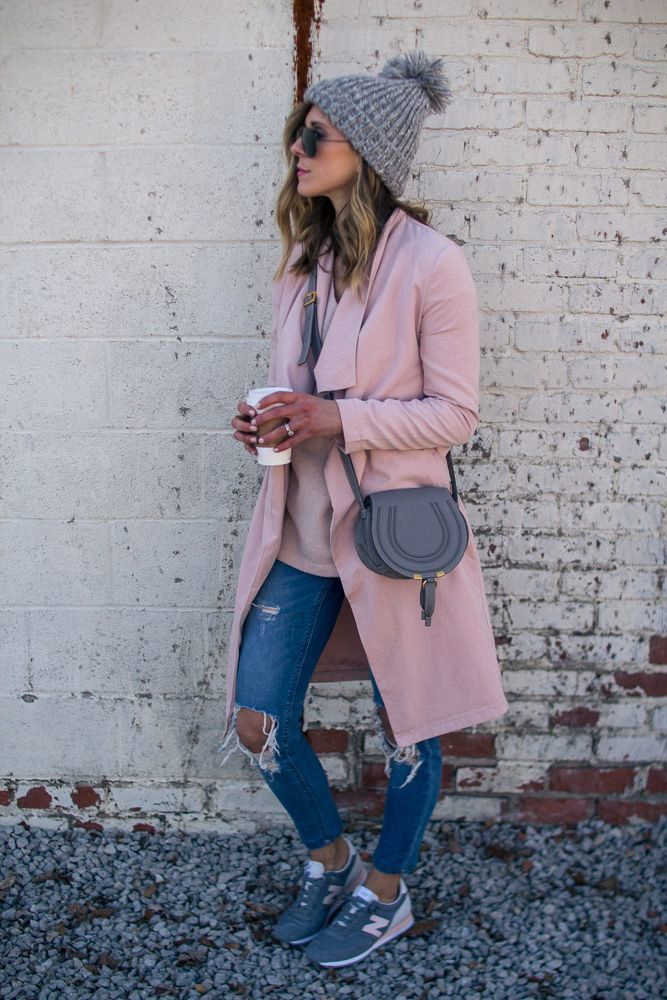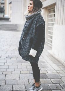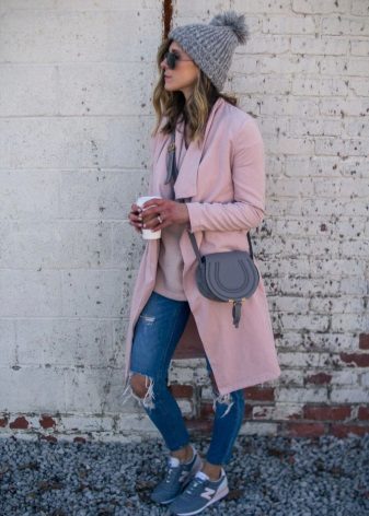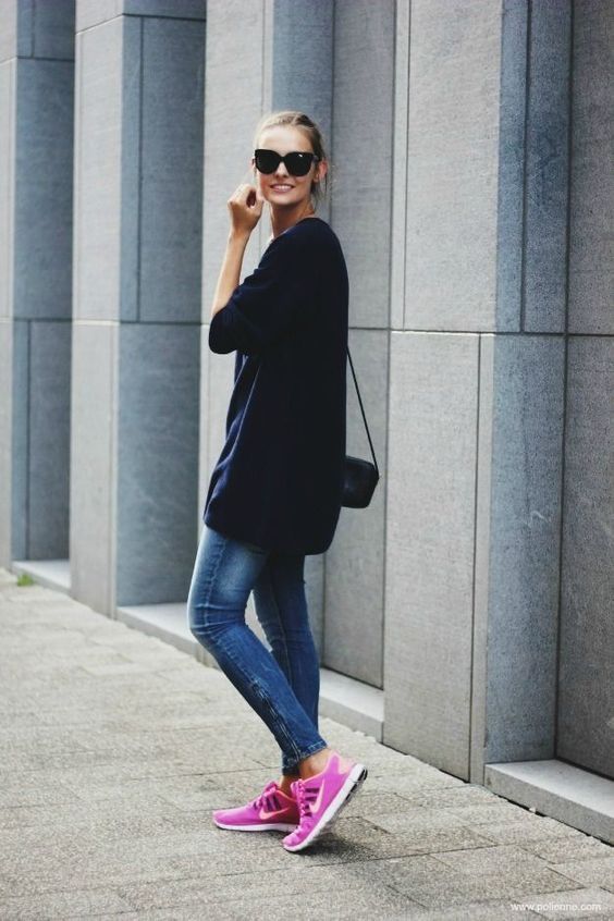 Blue skinny jeans, bright pink sneakers and a jumper with a color that matches the color of the shoe. A short gray overcoat, sunglasses and a comfortable clutch. You can go to the cinema, for a walk, and if you choose less flashy colors, this image is suitable for work.
