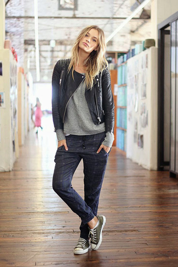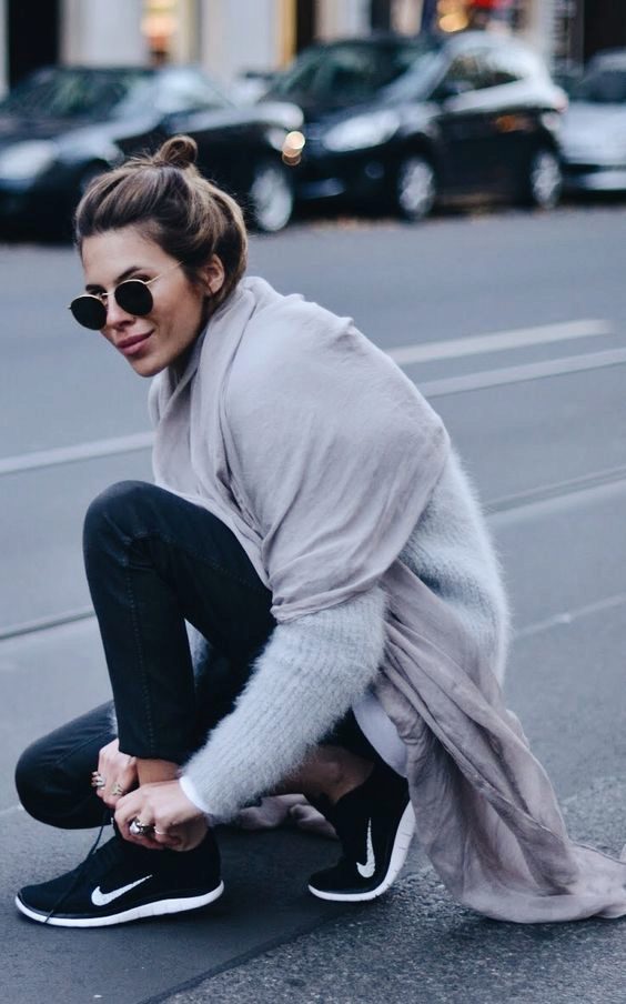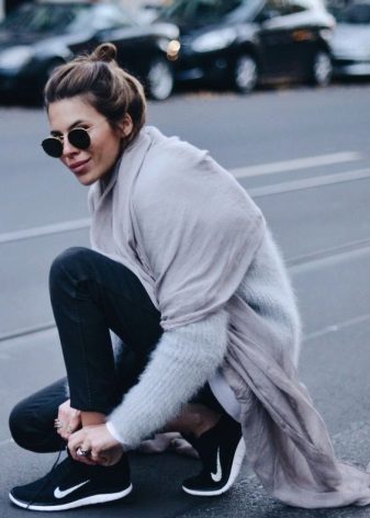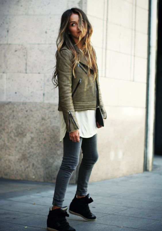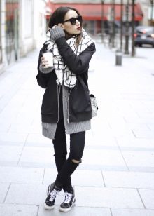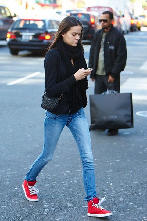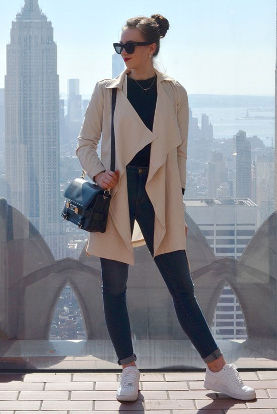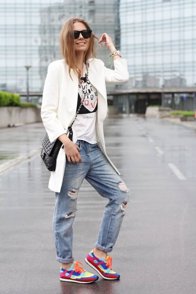 In the fall, wear them with a bomber jacket, denim, jacket-jersey. Duet sneakers + jeans will look great with a coat or trench coat of any length.