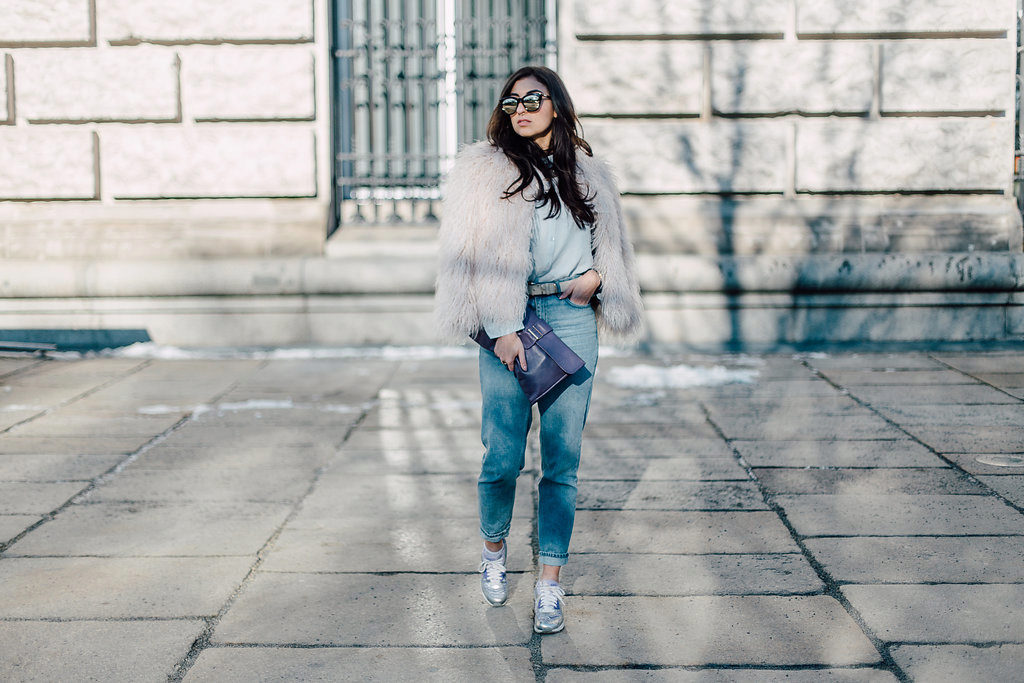 Put on your hipster mom-jeans, tuck in their light shirt, and on top casually throw in a short fur coat with a long nap. Metallic sneakers are the accent of the image. Complement this luxurious bohemian look with a lilac-colored clutch, sunglasses and stylish jewelery.