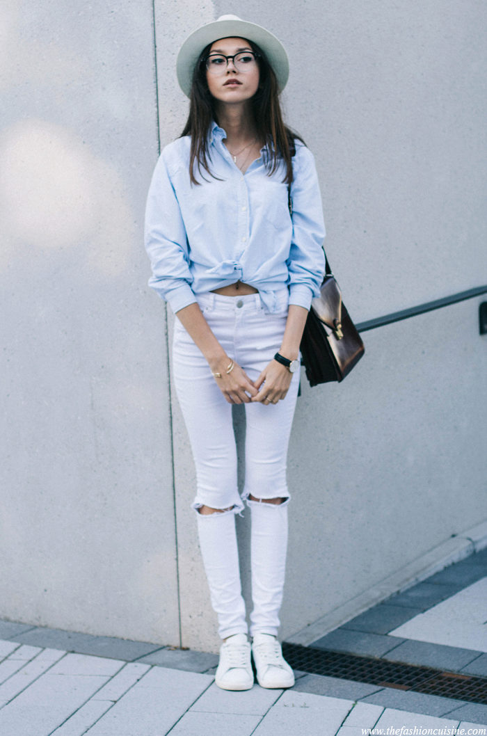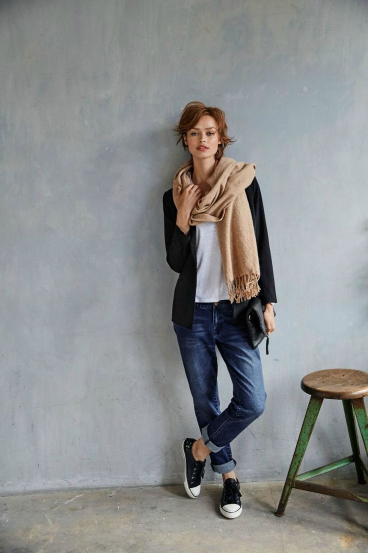White sneakers, strict jeans, shirt or turtleneck and blazer - a full look in the normcore style is ready!