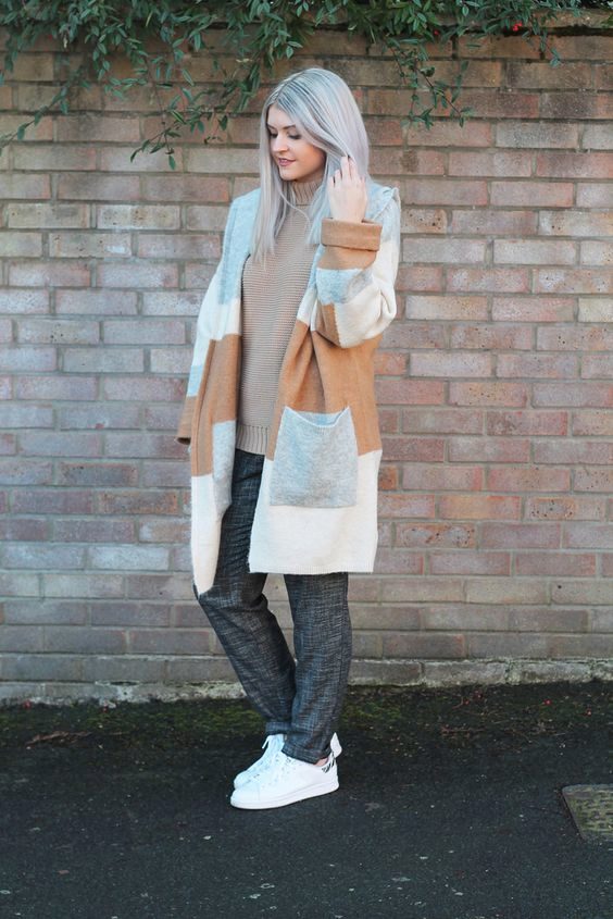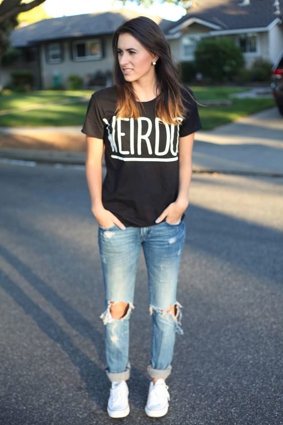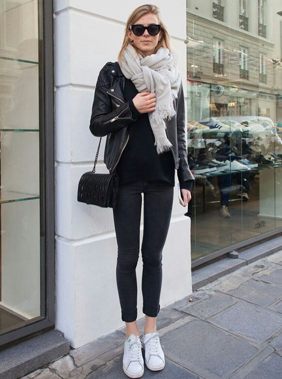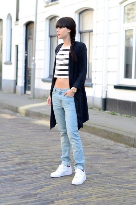 In casual looks, sneakers will look best with a white t-shirt with or without a print, vest or cropped top. From above you can wear a cardigan, blazer, leather jacket or unbuttoned shirt.