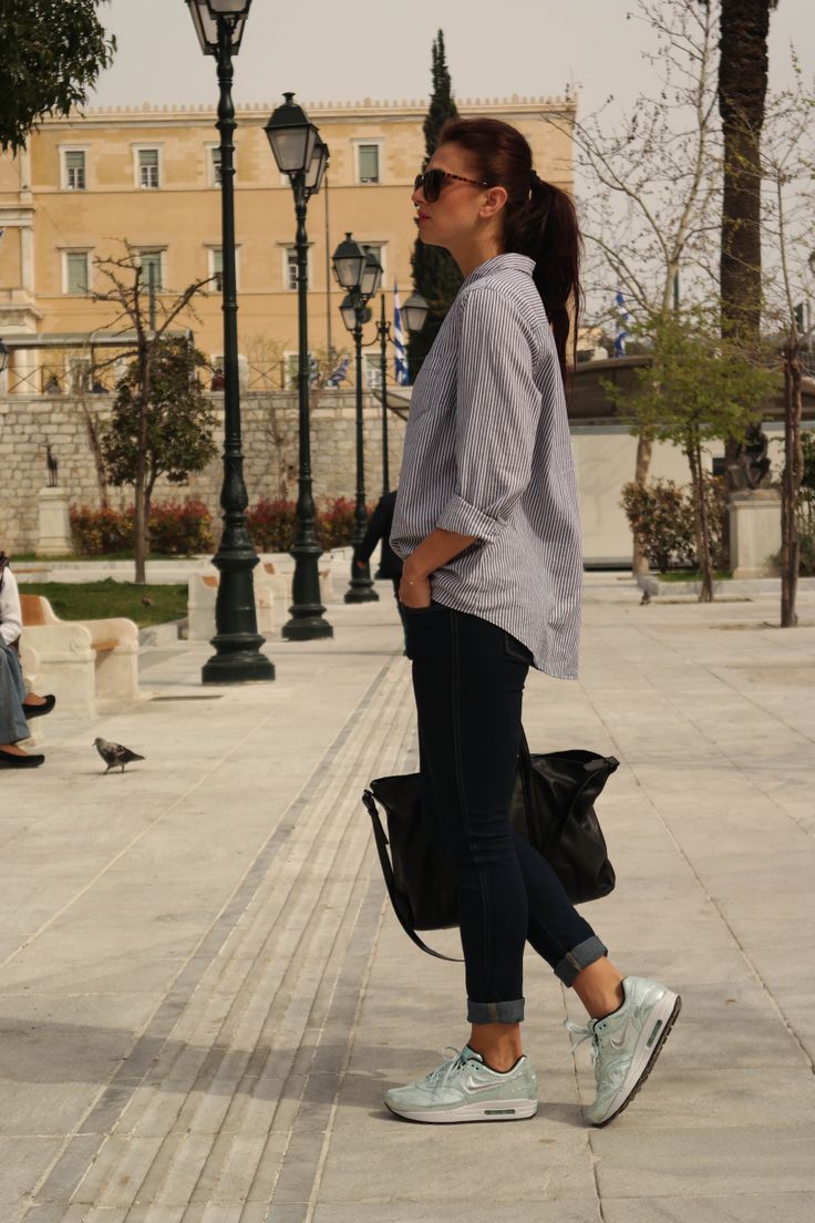 Just take a pastel color by the oson image, for example, mint. Lightweight T-shirt or blouse, comfortable tone sneakers, light-fitting boyfriends and a roomy bag. Suitable for long walks in the park with your chosen one.