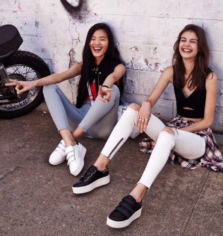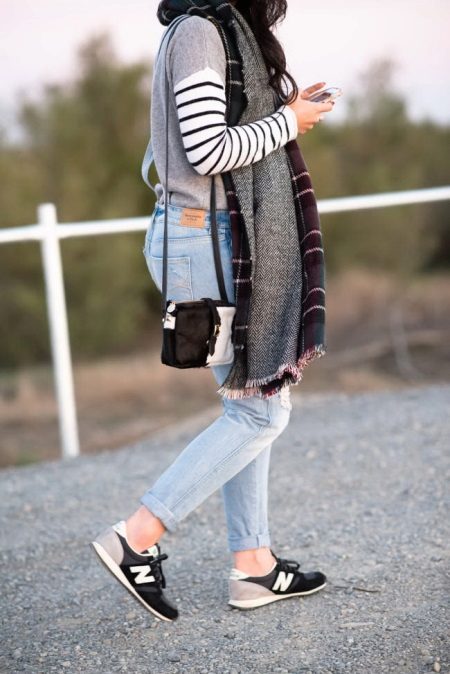 Do not forget that sneakers should look harmonious with the rest of your bow. If you want the legs to look longer, pick up shoes to match jeans. They can also be made a bright detail of your image by choosing a model of bright colors.