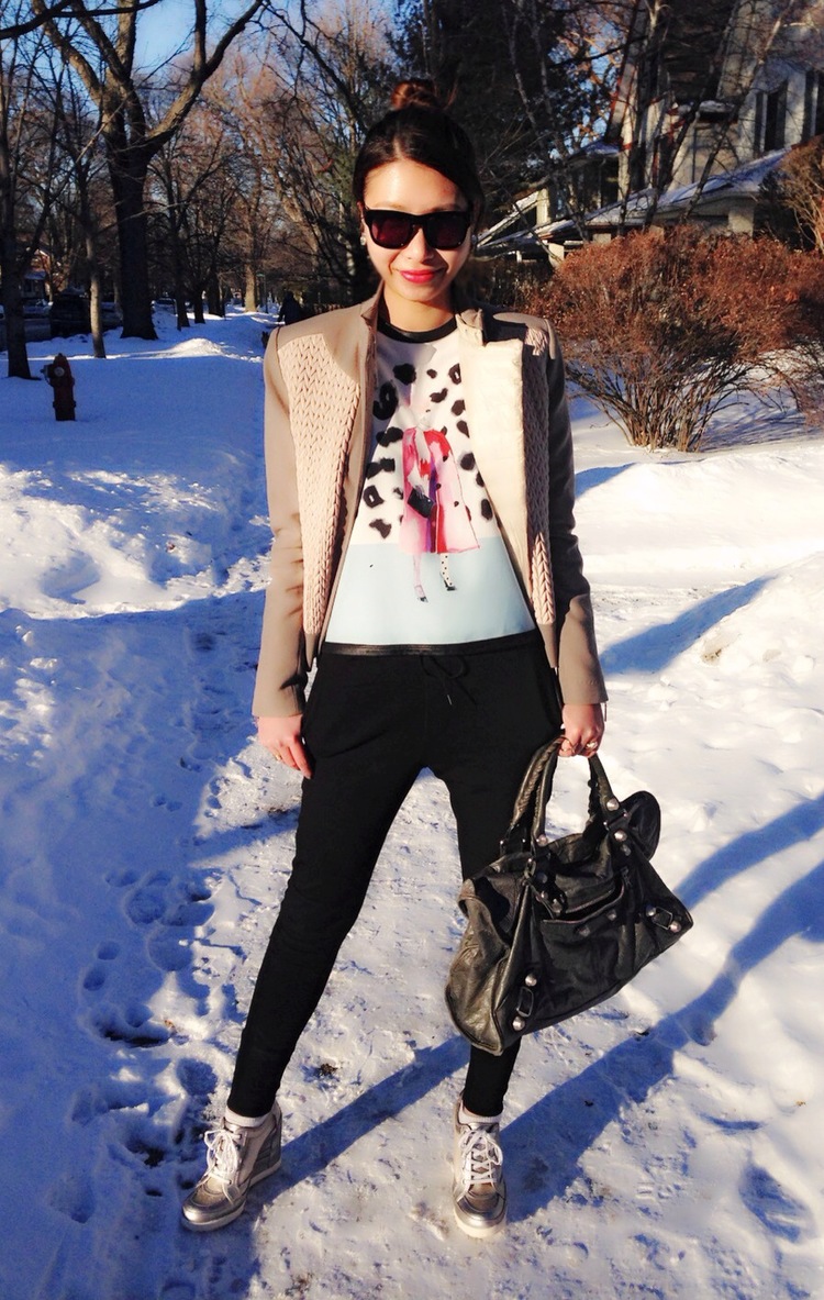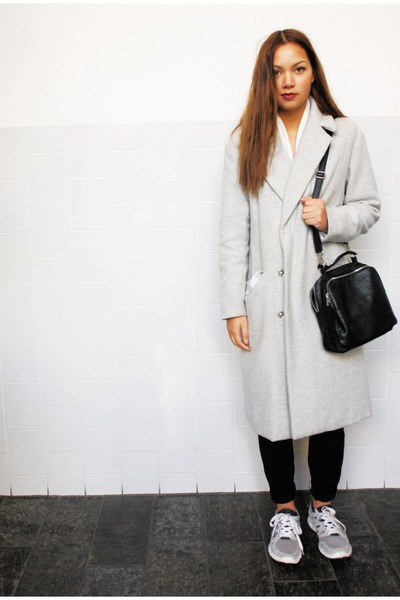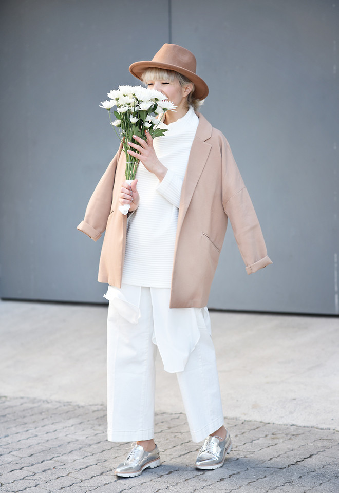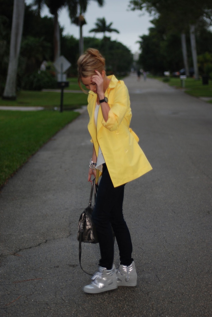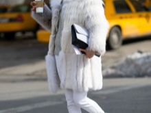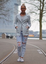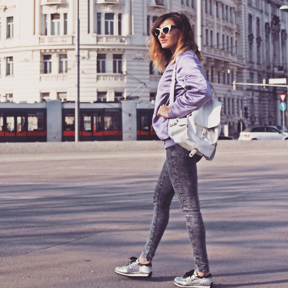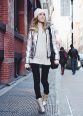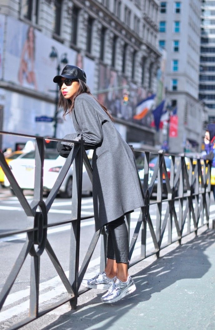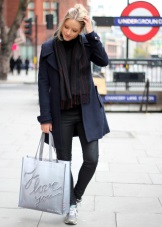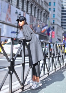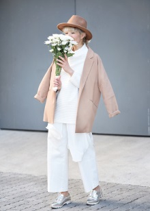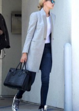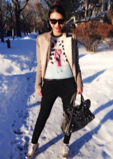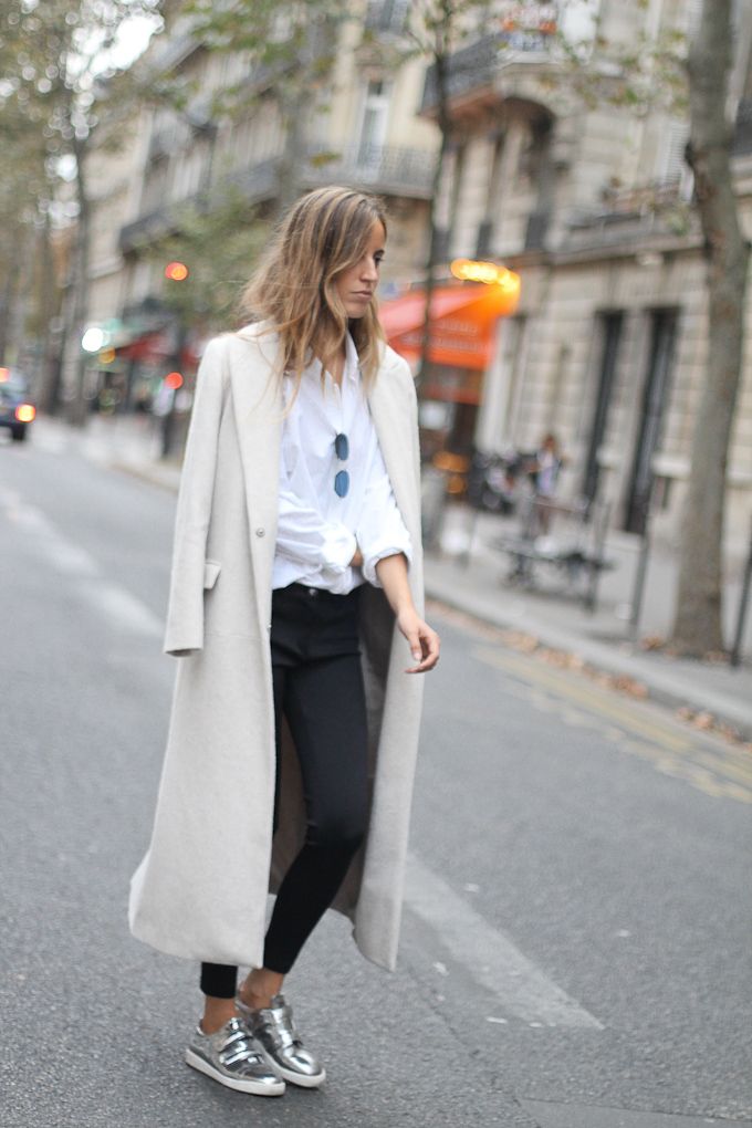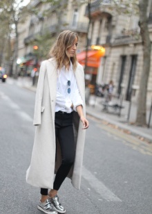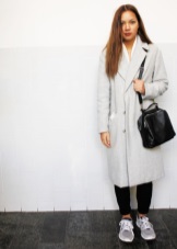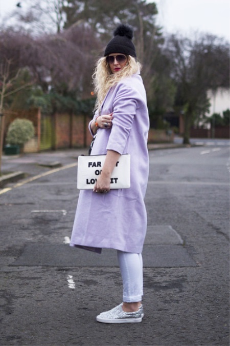 - Silver sneakers will make an excellent pair of pastel lilac coat. Wear them with light-colored jeans, complementing your look with a white clutch and a black volumetric hat with a fur pompon.