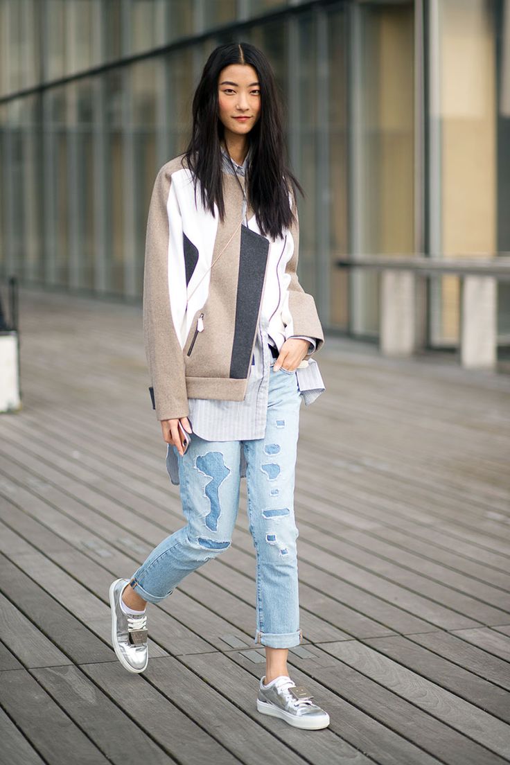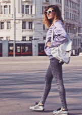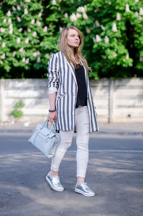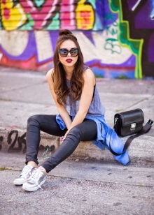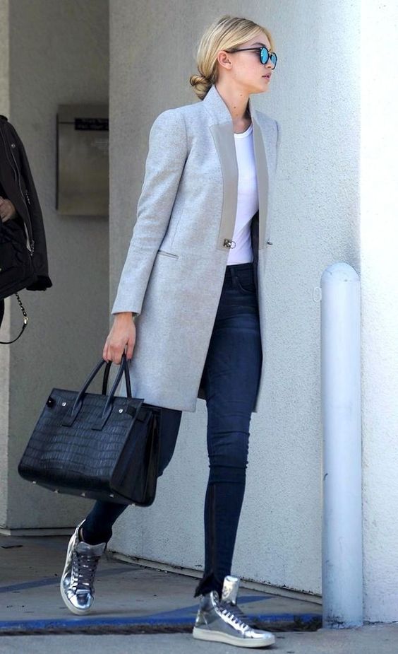 Silver sneakers will look great with skinny jeans and ripped boyfriends, skinny pants, chinos, and matte leather leggings. In this case, the top of your bow can be anything: a turtleneck, top, jumper, sweatshirt, shirt, T-shirt. As outerwear, you can choose a straight coat or oversize coat, a leather jacket, a long sleeveless jacket, and a bomber jacket.