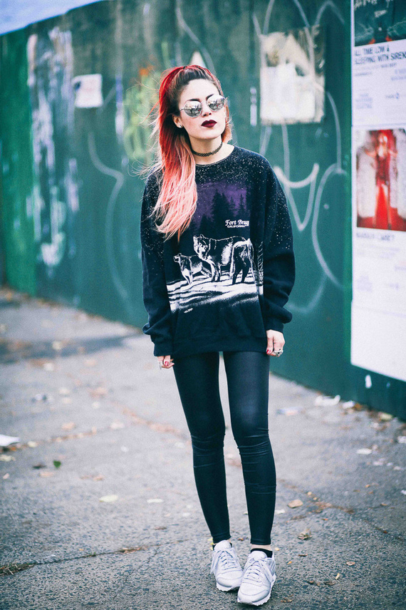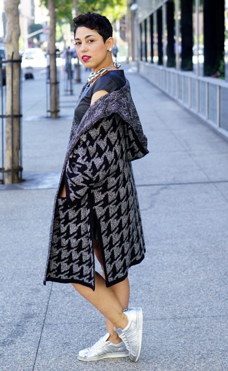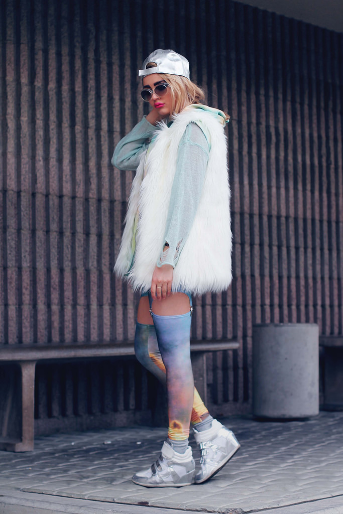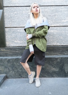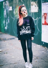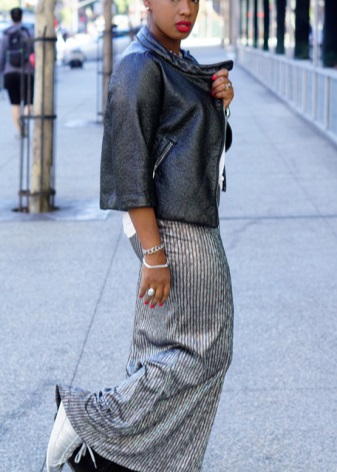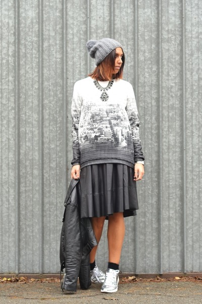 - Stylish urban look. Leather midi skirt style "sun", black and white sweatshirt, jacket, leather jacket, gray hat and silver sneakers with black socks. The image is complemented by a spectacular massive necklace.