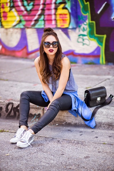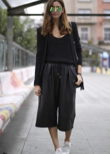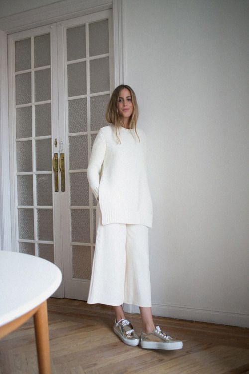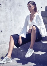 The best way to show off shiny shoes is to wear them with cropped trousers. Culottes will make a perfect pair of silver sneakers. Despite the fact that the skirt-pants is a representative of business style, in practice they look great with semi-sports shoes.