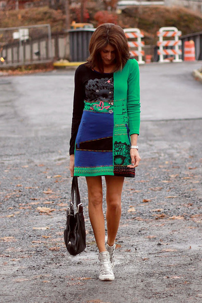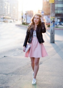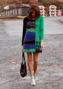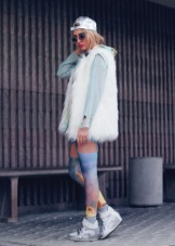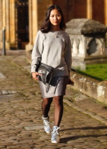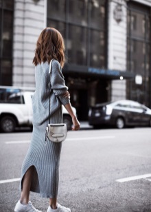 A volumetric knitted dress will look great with silver sneakers. Especially if you choose knitwear in gray, white or melange color. In other matters, the dress can be replaced with a suit from a pencil skirt and a crop top, which are incredibly relevant today. Such a game on contrasts will not leave anyone indifferent, the combination of textured wool and smooth shiny skin look very impressive! No less attractive looks from other materials.