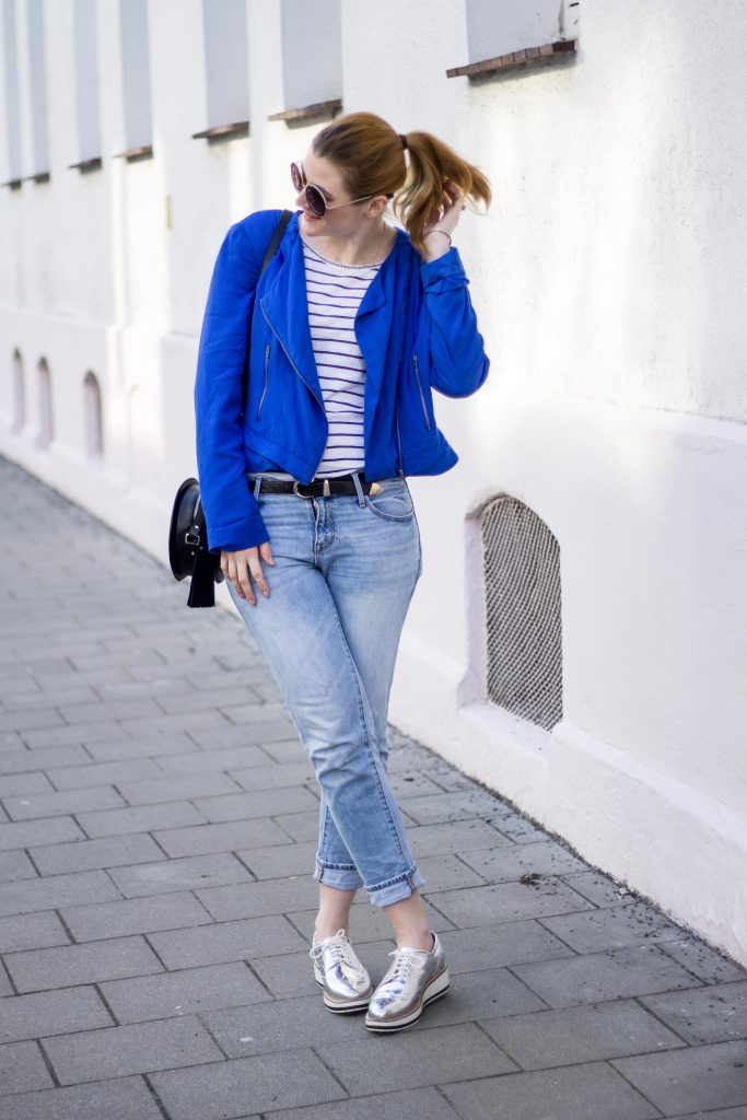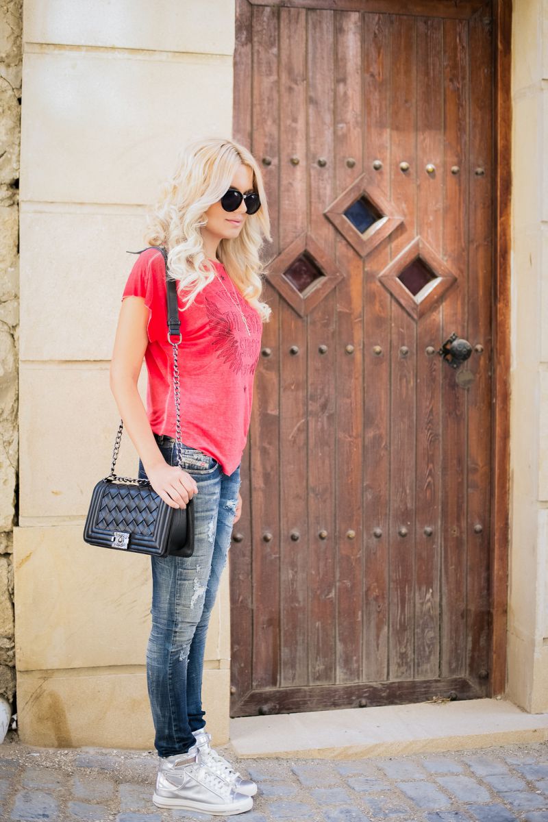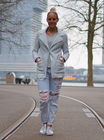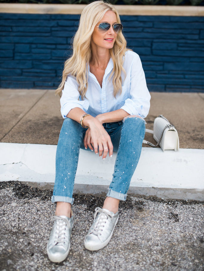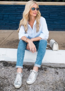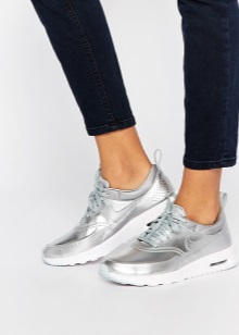 Silver sneakers have long been considered versatile, just like black or beige shoes. Even plain jeans in combination with them will look in a winning light.