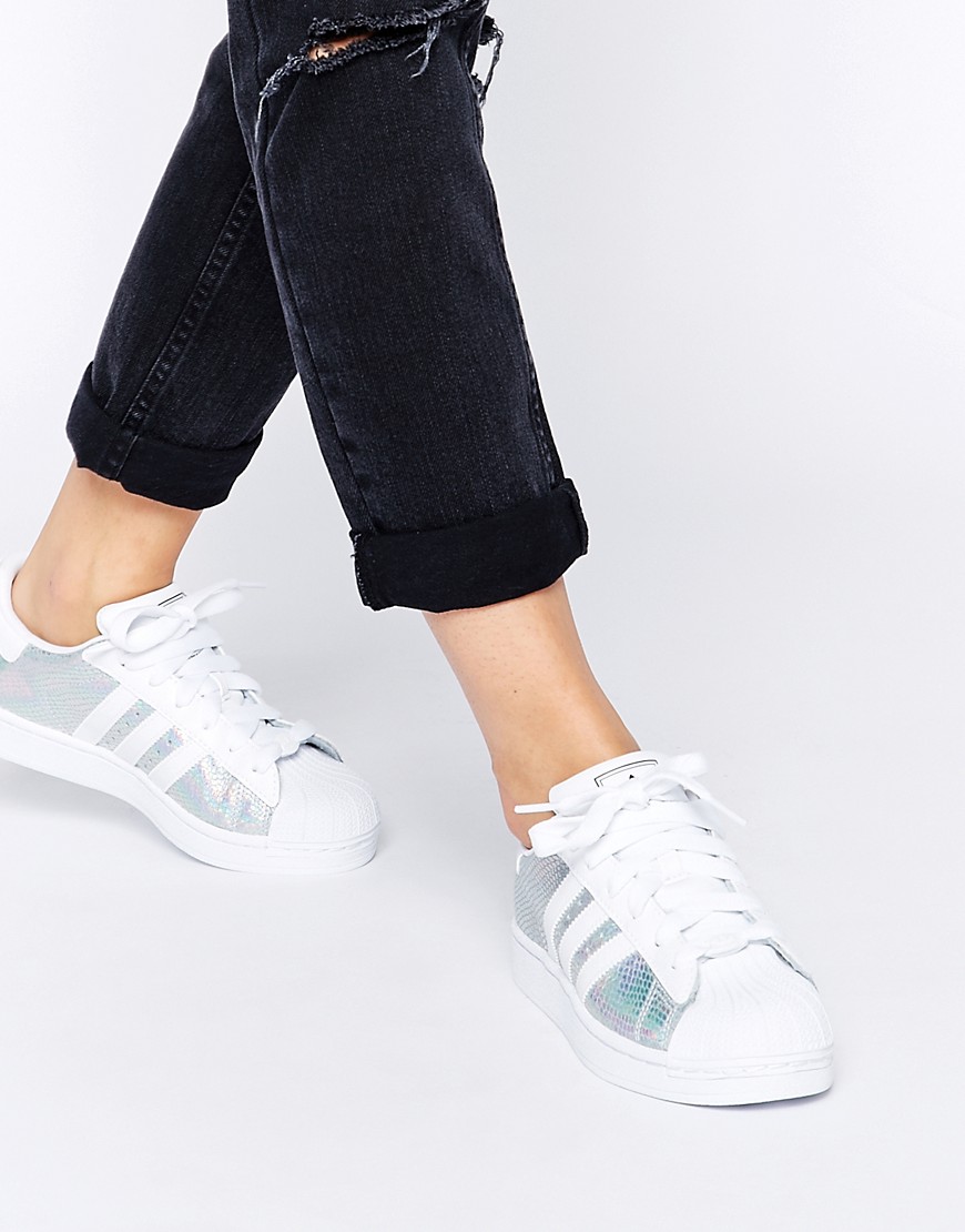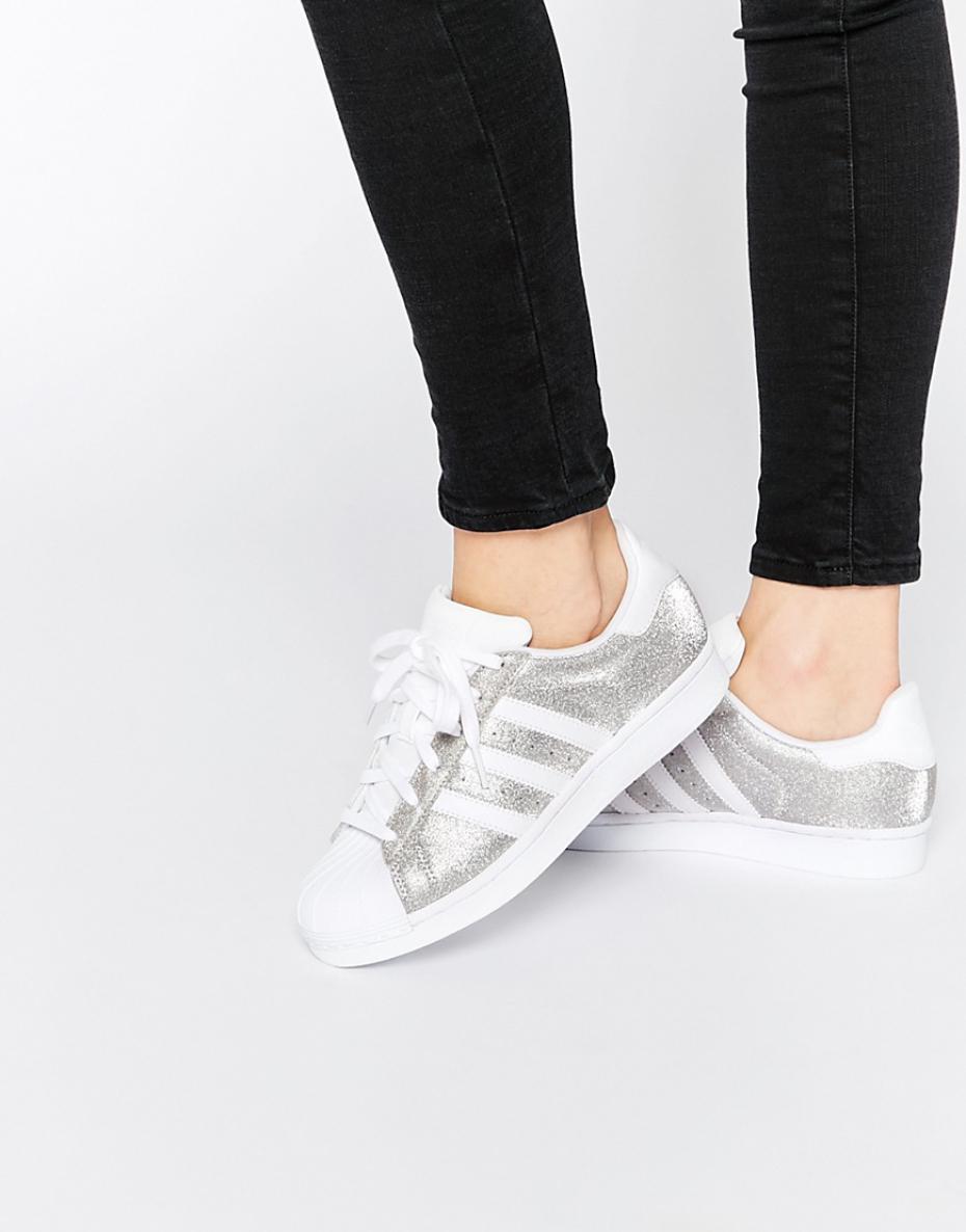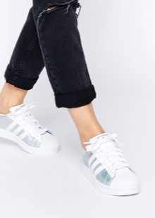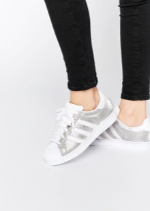 The legendary Adidas Superstar sneakers are presented in various variations. There are fairly discreet models in white with silver or holographic stripes. There are sneakers, completely made of silver leather, both matte and glossy.Textile models with a gliterre are popular, which attract attention of themselves with a scattering of iridescent particles.