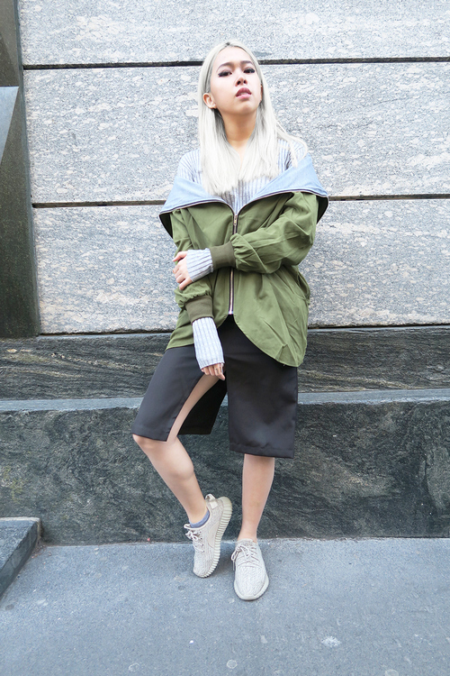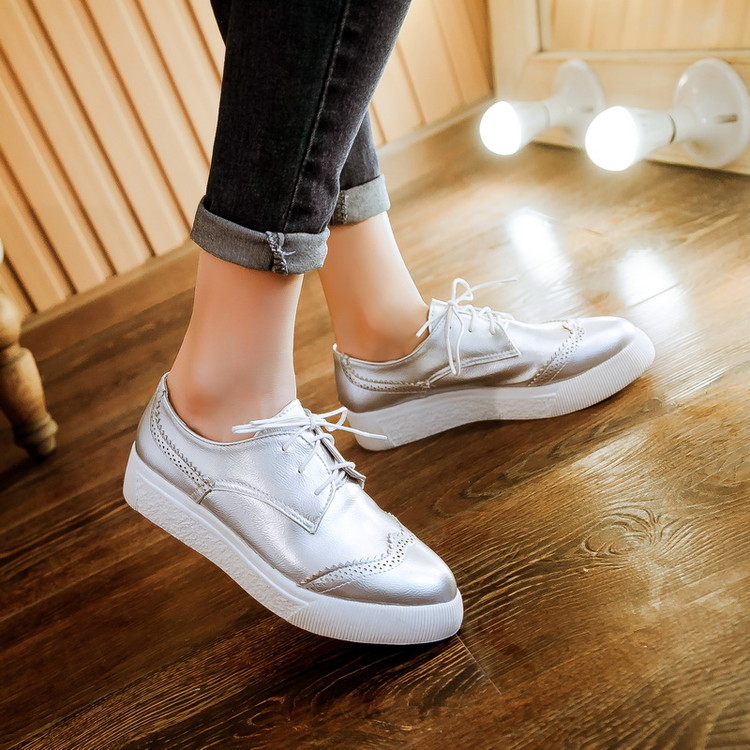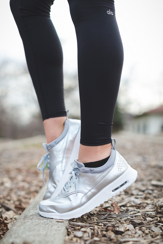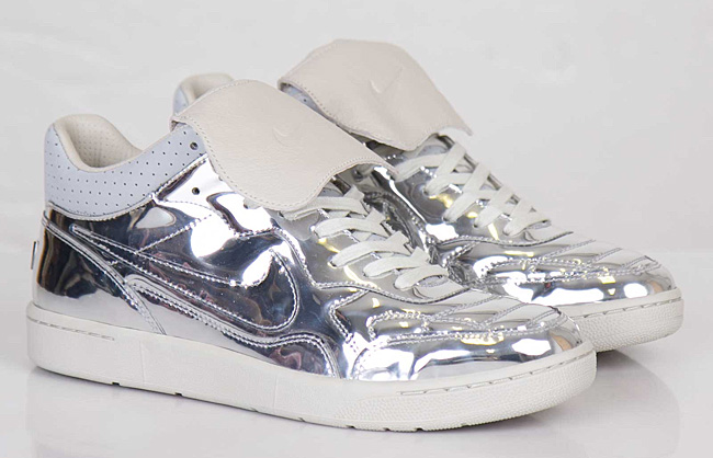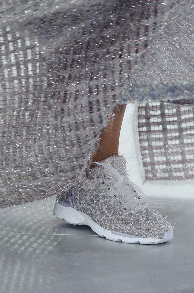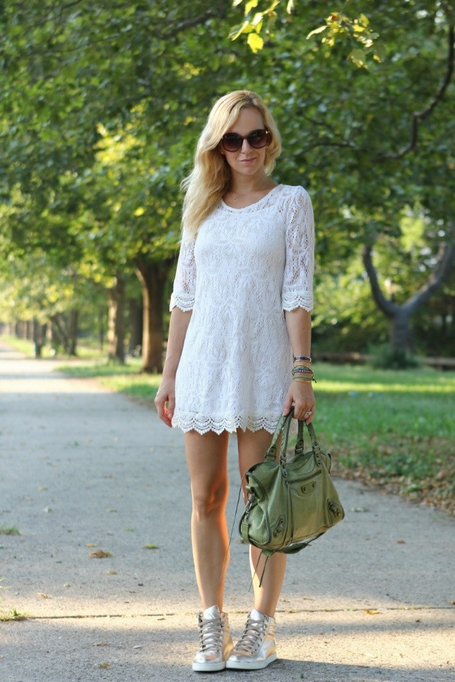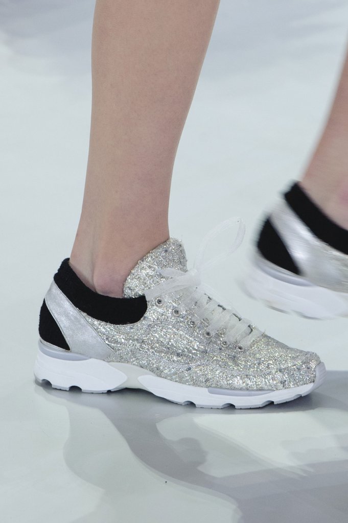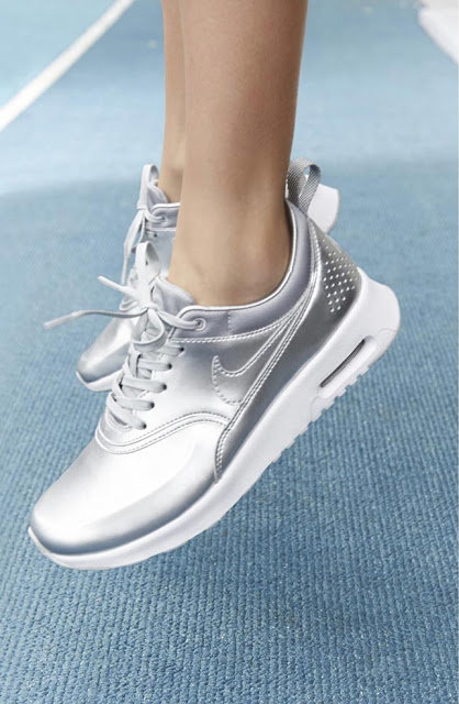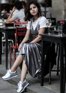 Since the silver color does not look contrast on light skin, it helps visually slightly lengthen the leg. Therefore, metallic sneakers can be safely worn with dresses and skirts.