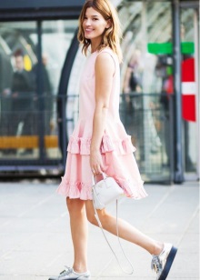 - On a date, you can wear a blue lace midi-length dress, complementing the image with silver sneakers and a tonal bag. Stop your image on a small clutch envelope or a voluminous bag that can be decorated with a silk scarf. Surprise your chosen one with a gentle, but at the same time unusual bow.