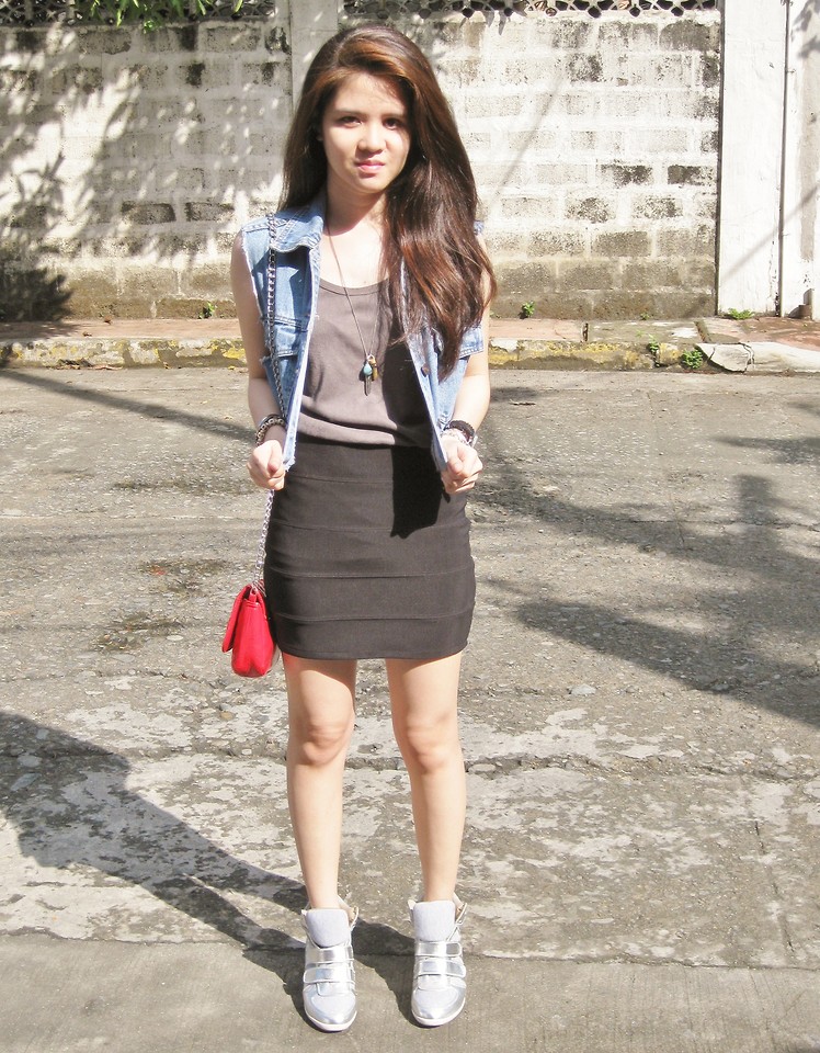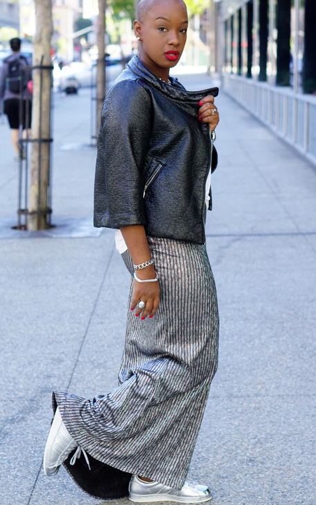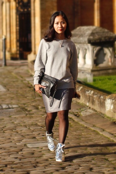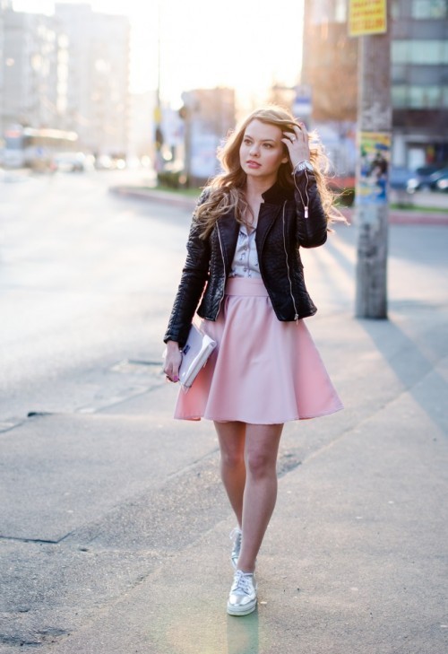 Midi skirt will look great with almost any shoe, and it just fits perfectly to shiny sneakers. Sneakers paired with an elegant skirt also look quite elegant.
