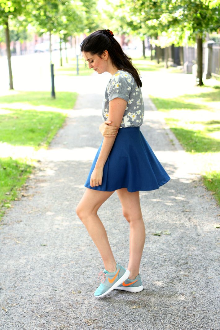 Sneakers are often quite massive shoes, at least visually, so they will look more harmonious with tight pants and jeans. As for the style, it is easy to combine sneakers with sportswear and casual wear. First of all, we are talking about jeans, especially skinny, leggings, short shorts and capris, as well as short skirts.